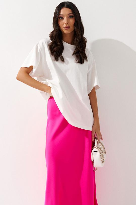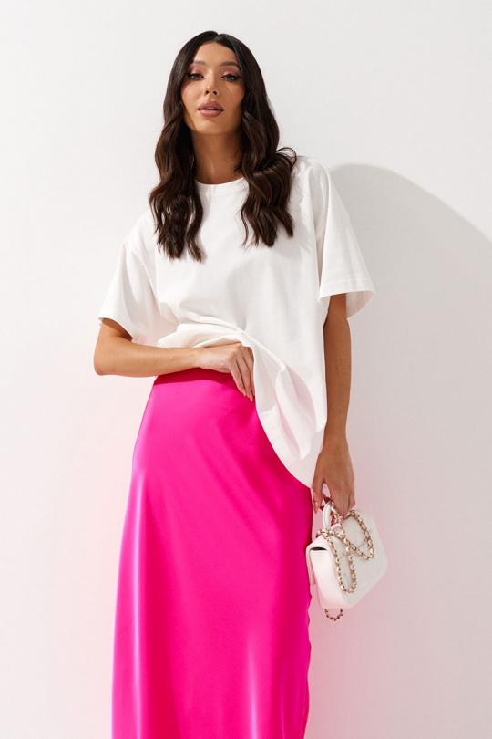 Юбка полуприлегающего силуэта выполнена из струящейся ткани ярко-розового цвета. Характеристики: полуприлегающий силуэт, подкладка, пояс на резинке на подгибе.