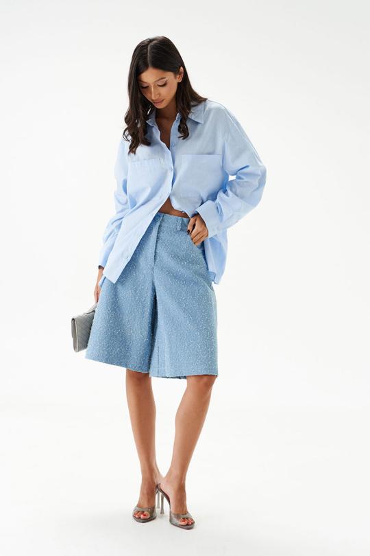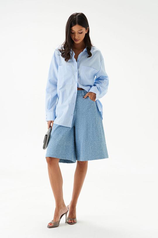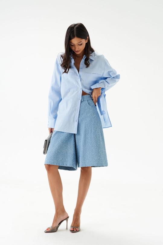 Шорты-бермуды. Выполнены из джинсовой ткани голубого цвета с потёртостями. Без подкладки. Пояс стабильный, со шлёвками. По переду фигурные карманы. По заднему полотну кокетка, накладные карманы. Застёжка центральная - пуговицы, молния. Шорты дополнит жилет А5478.