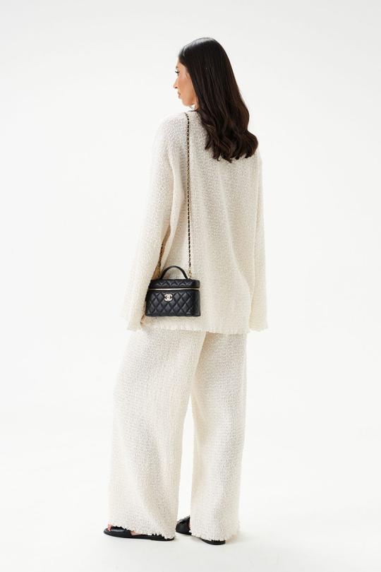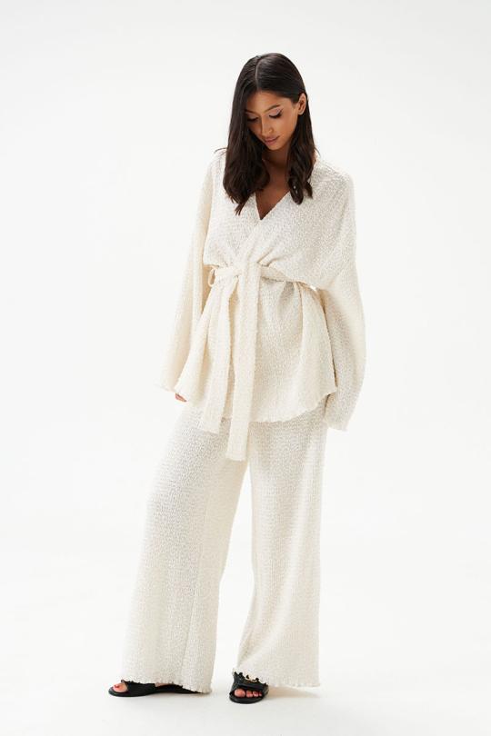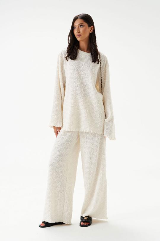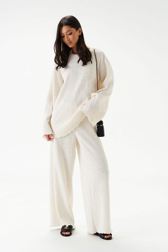 Брюки свободного кроя выполнены из полотна "букле-венгерка" молочного цвета. Характеристики: прямой крой, пояс на резинке на подгибе.