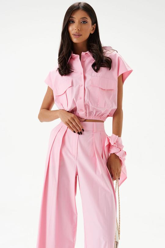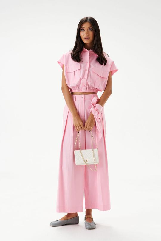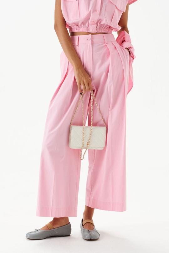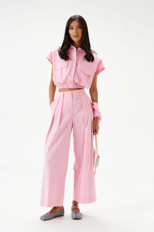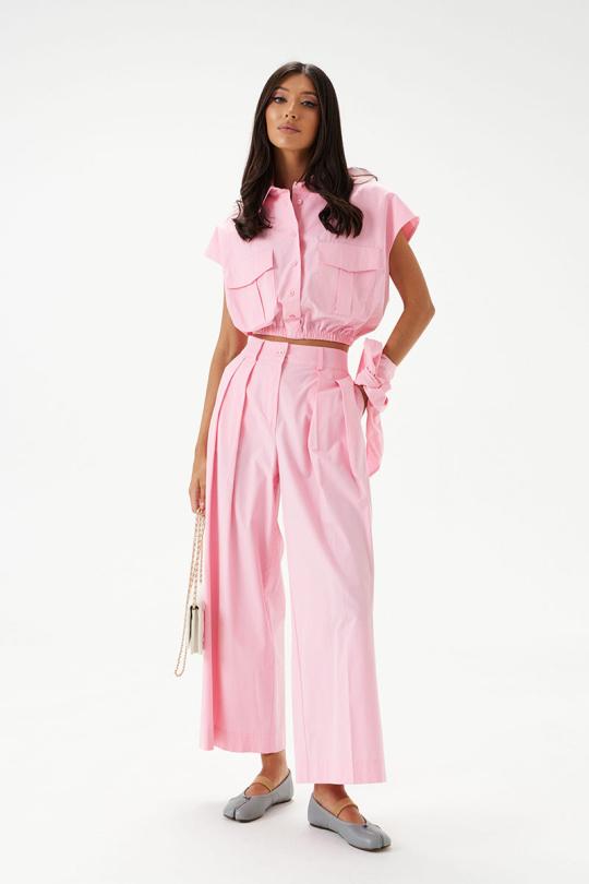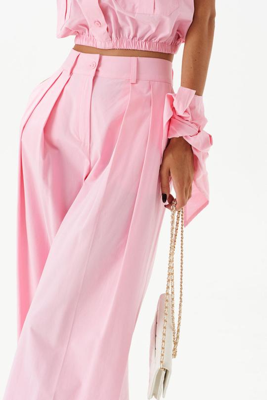 Брюки свободного кроя, выполнены из хлопкового полотна нежно-розового цвета. Характеристики: прямой крой, пояс стабильный, застегивается на пуговицу и молнию, по поясу нашиты шлевки. В боковых швах карманы. Заутюженные стрелки по передней и задней частям брюк.