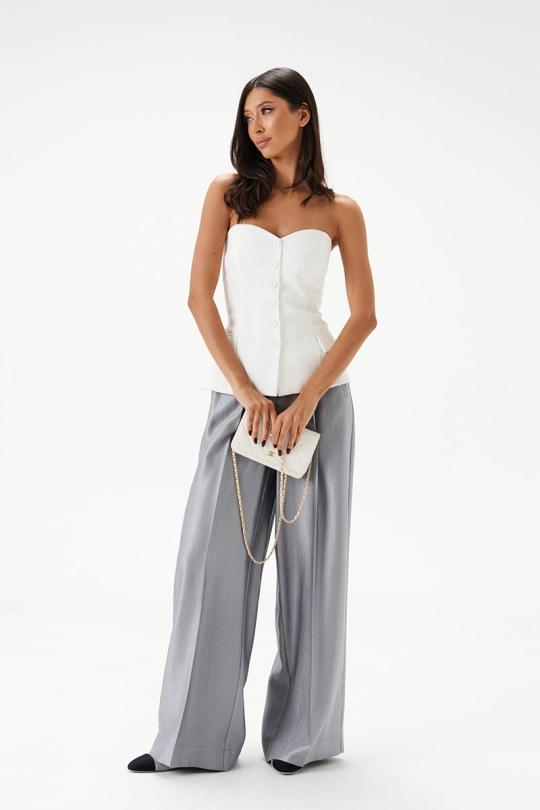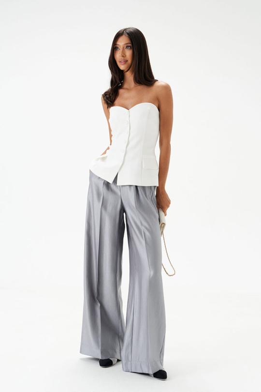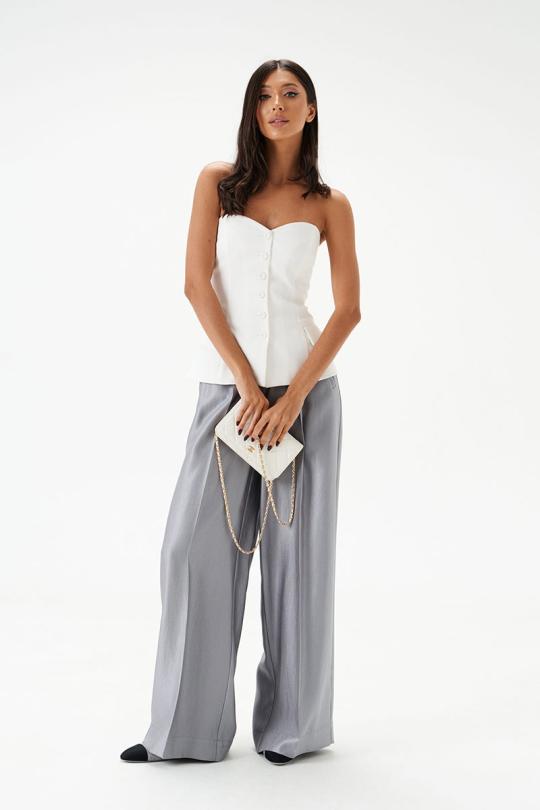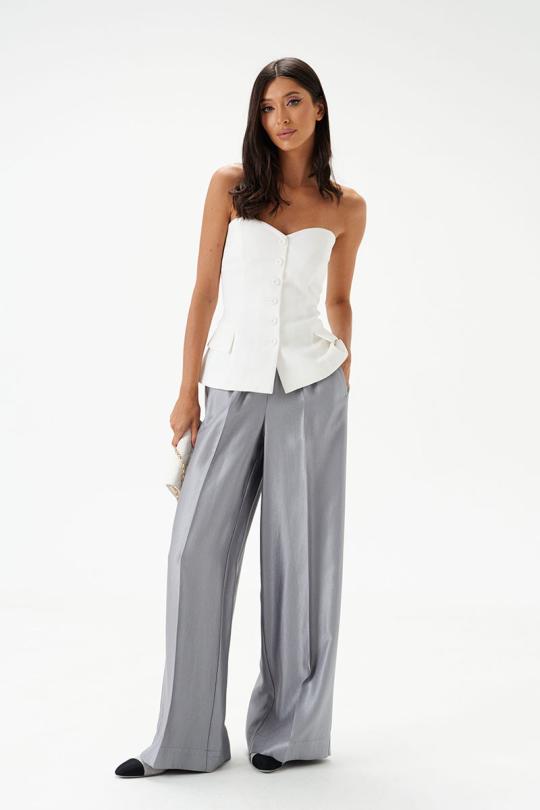 Брюки прямого свободного кроя. Выполнены из текстильной ткани с мягким блеском. Характеристики: пояс на резинке, в боковых швах карманы, стрелки по переду и сзади изделия.