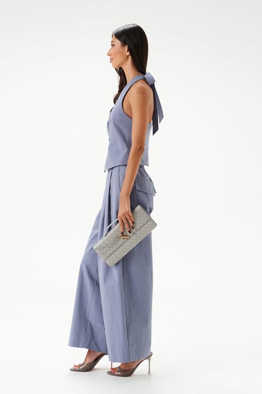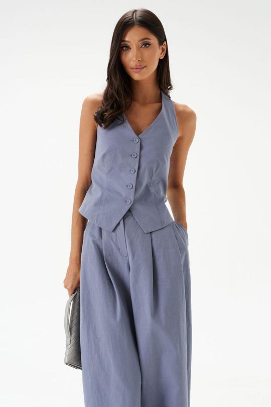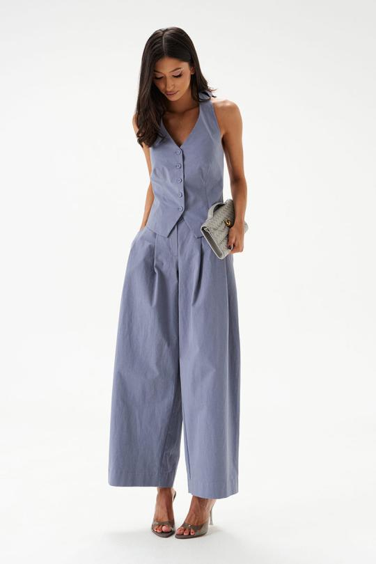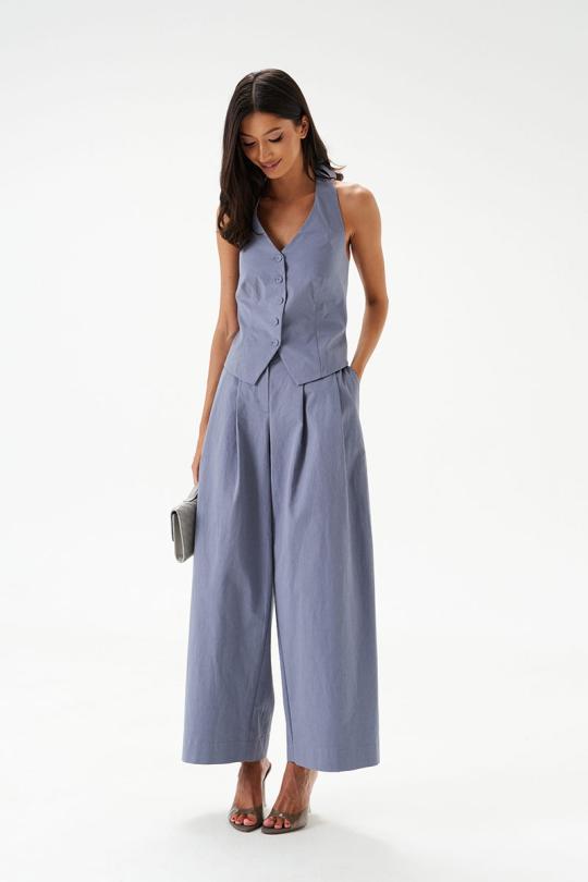 Брюки свободного кроя. Выполнены из хлопкового полотна серо-голубого цвета. Пояс по переду стабильный, пояс по спинке на резинке. По переду от пояса складки. В боковых швах карманы с отрезным бочком. По заднему полотну накладные клапаны (имитация карманов). Застёжка центральная молния, пуговица. Брюки дополнит жилет А5483.