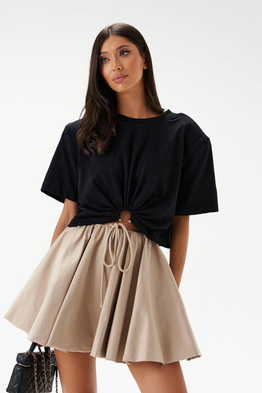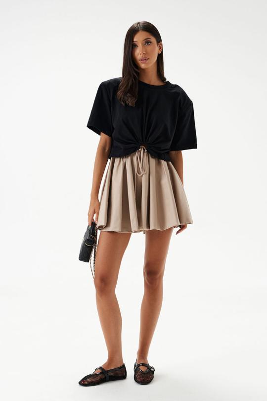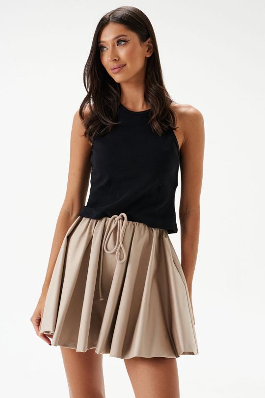 Юбка-баллон, выполнена из текстильной ткани песочного цвета. На хлопковом подкладе. Расширенная к низу. Пояс на резинке со шнурком-завязкой.