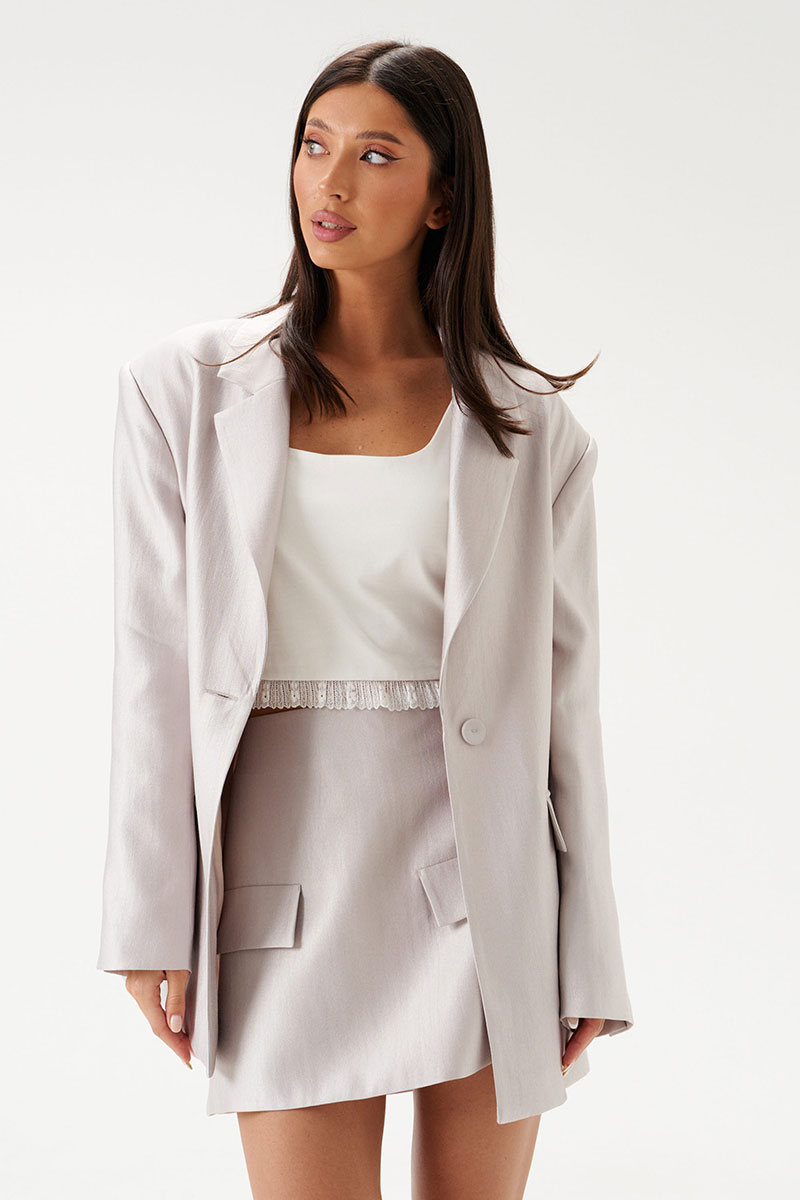 Юбка-мини. Выполнена из текстильного полотна в жемчужном цвете. Силуэт - трапеция, стабильный пояс, есть подкладка. Застежка - молния в шве заднего полотна изделия.