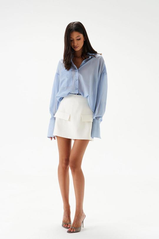 Юбка-мини. Выполнена из текстильного полотна в жемчужном цвете. Силуэт - трапеция, стабильный пояс, есть подкладка. Застежка - молния в шве заднего полотна изделия.
