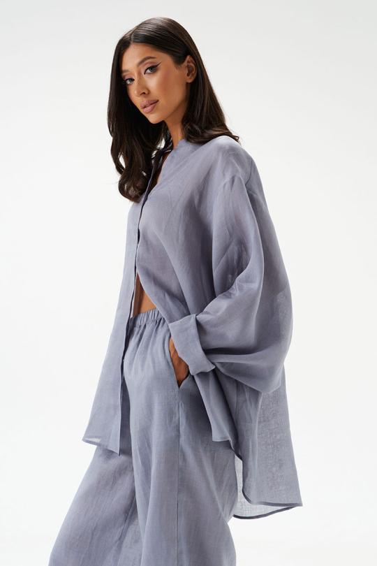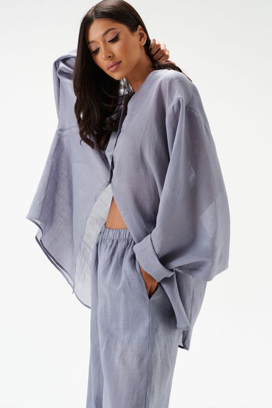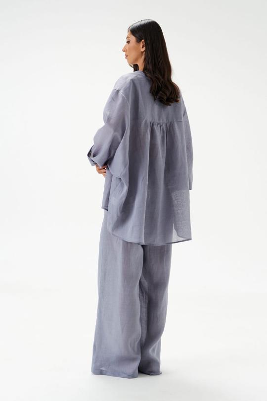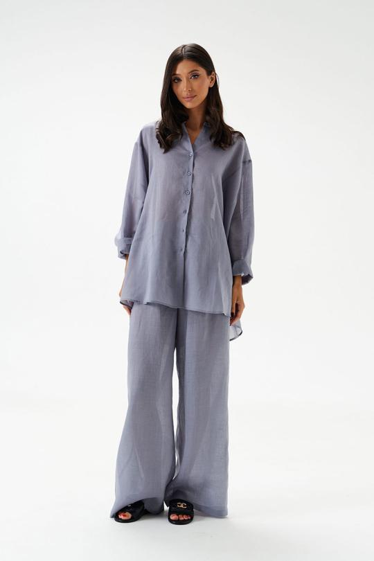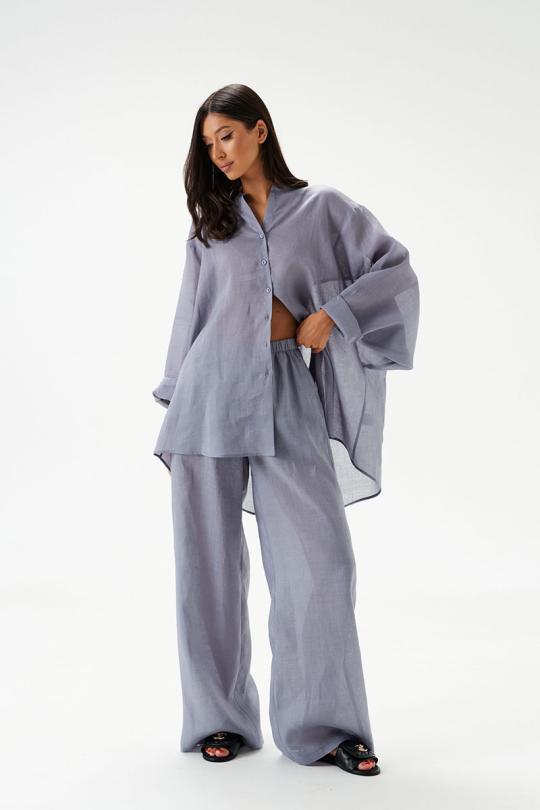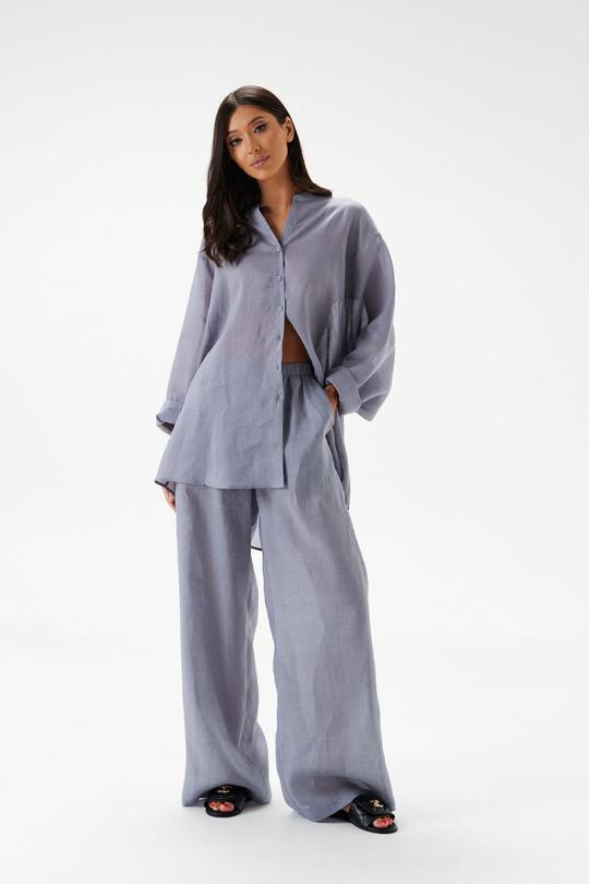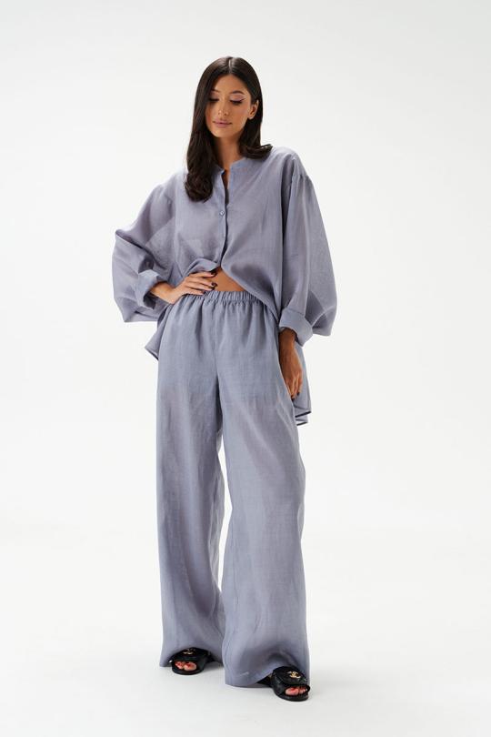 Брюки прямого, свободного кроя. Выполнены из натурального полотна Рами, пыльно-голубого цвета. Характеристики: свободный крой, пояс на резинке, в боковых швах карманы. Подкладка - шорты 28см.