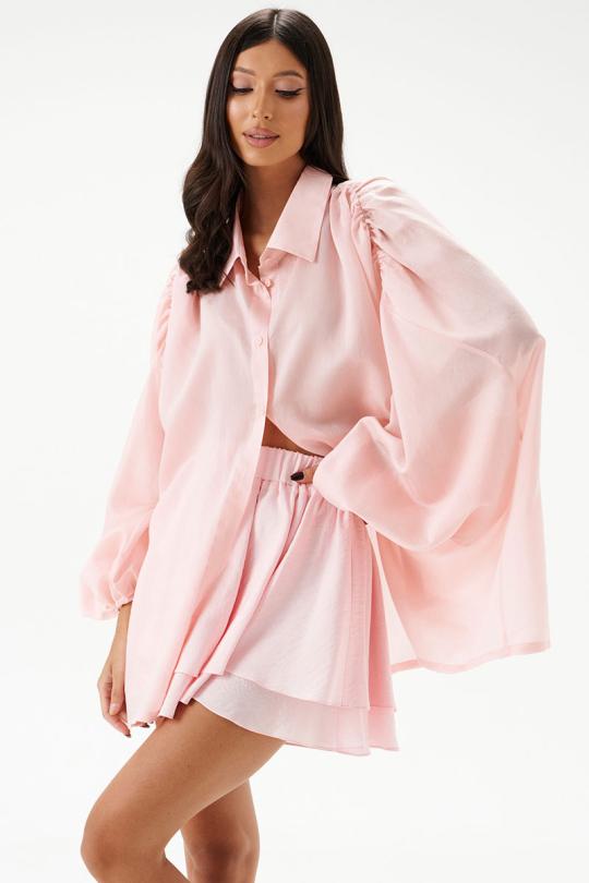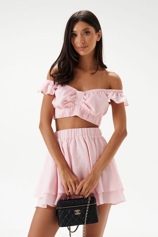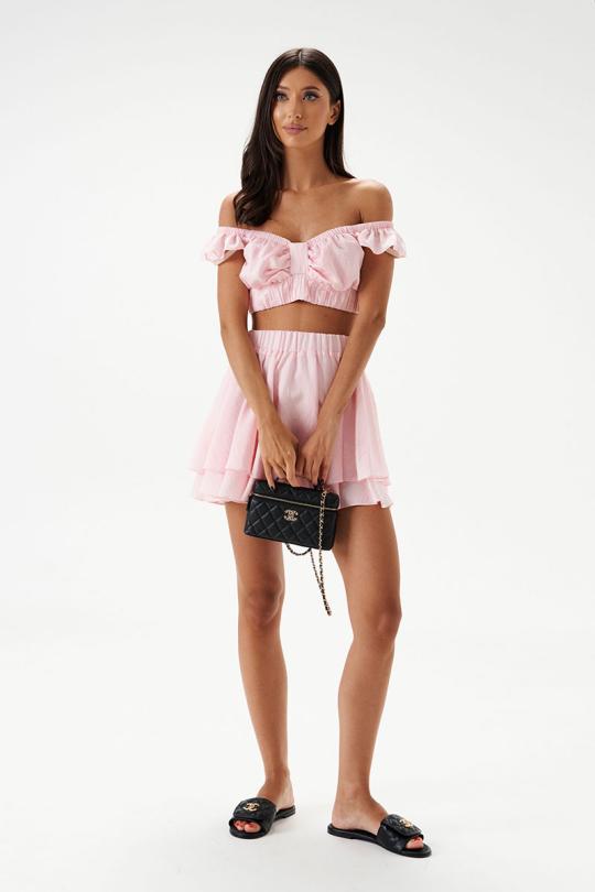 Юбка-мини, выполнена из текстильной ткани нежно-розового цвета. Без подкладки. Характеристики: двуслойная, пояс на резинке.