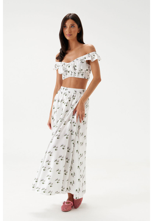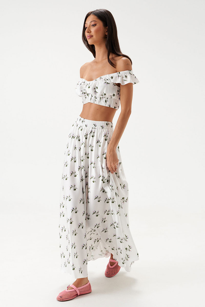 Юбка свободного кроя, выполнена из полотна белого цвета с цветочным принтом. Характеристики: крой полусолнце, подкладка мини шортиками, по бокам изделия шов, пояс на резинке со сборкой.