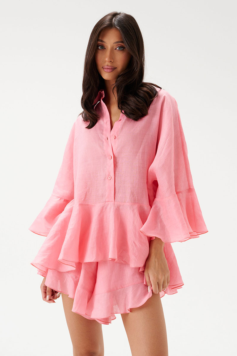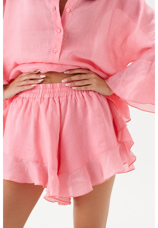 Шорты свободного кроя, выполнены из лёгкого натурального полотна розового цвета - рами. Пояс на резинке, есть подкладка, по низу шорт нашита рюша из ткани основного изделия.
