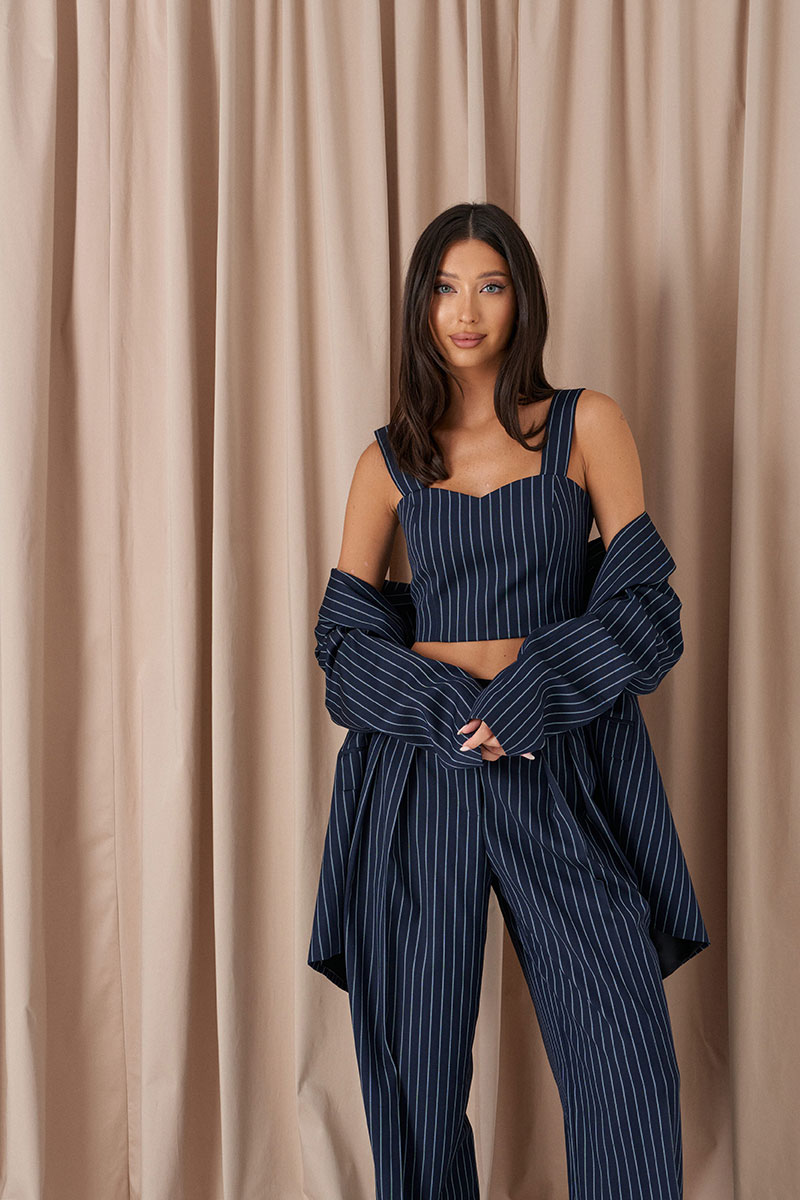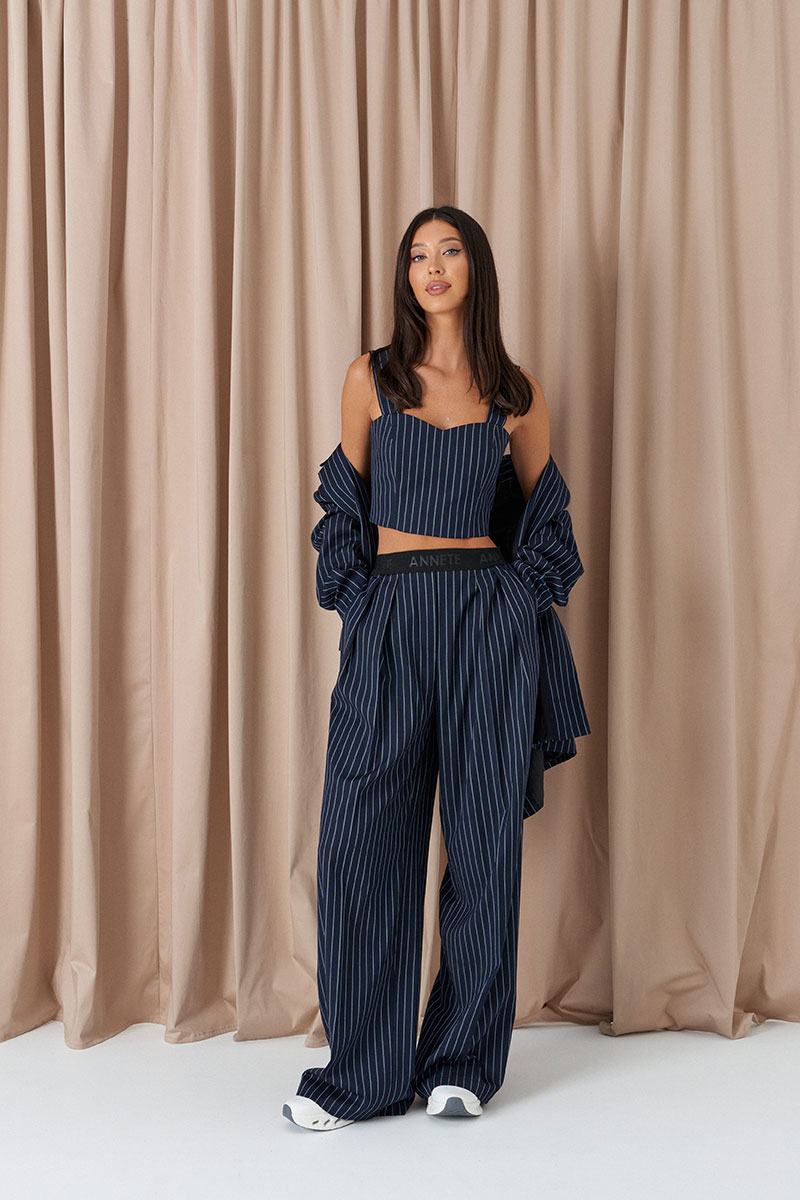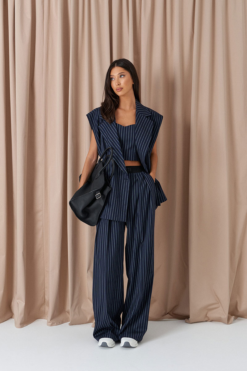 Брюки прямого свободного кроя. Выполнены из костюмной ткани синего цвета с полоской голубого цвета. Пояс на резинке чёрного цвета (брендированной). От пояса складки. По передней части заутюженные стрелки. Имитация застёжки. Наклонные карманы из боковых швов. Брюки дополнят топ А2277, жилет А5495.