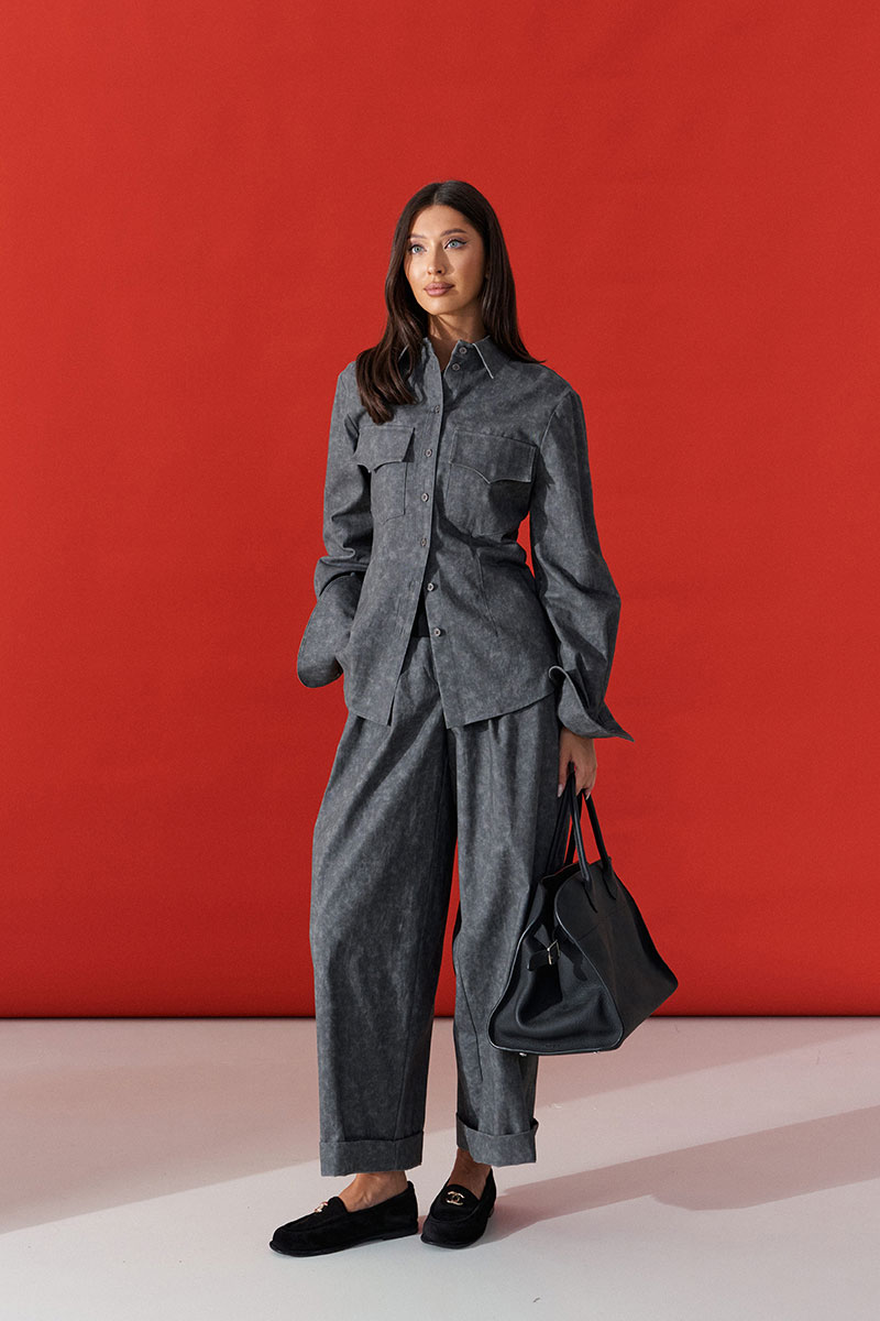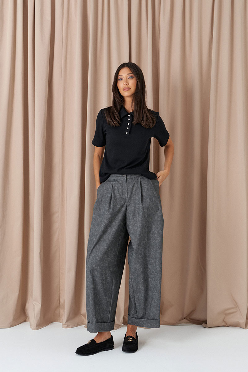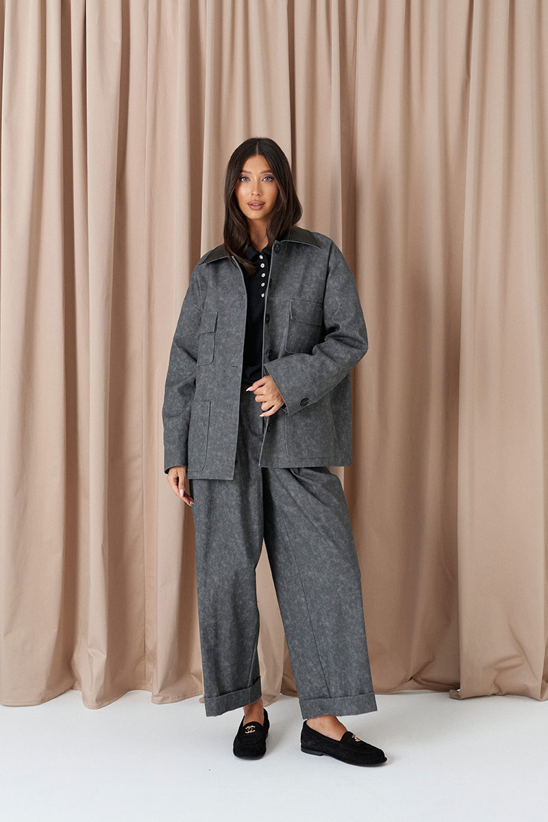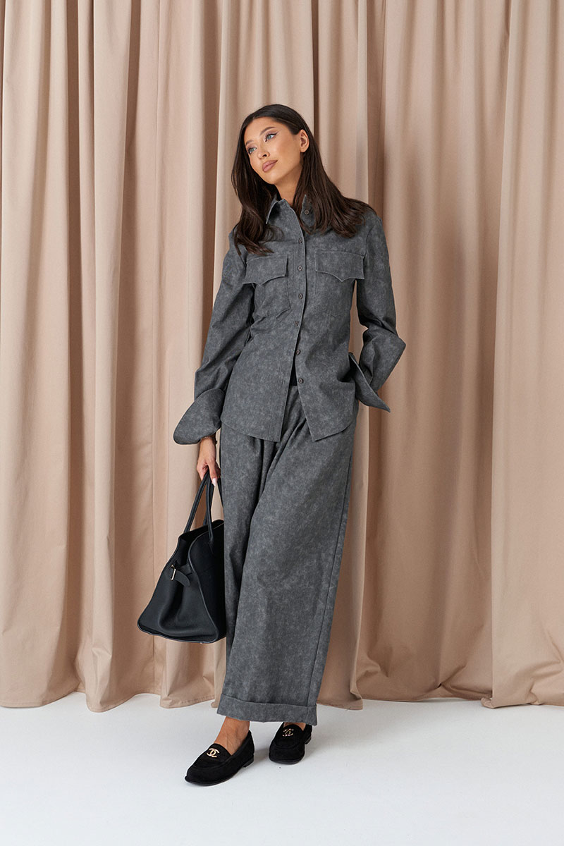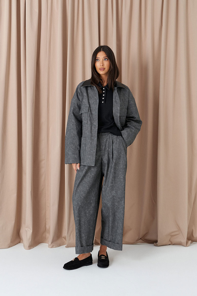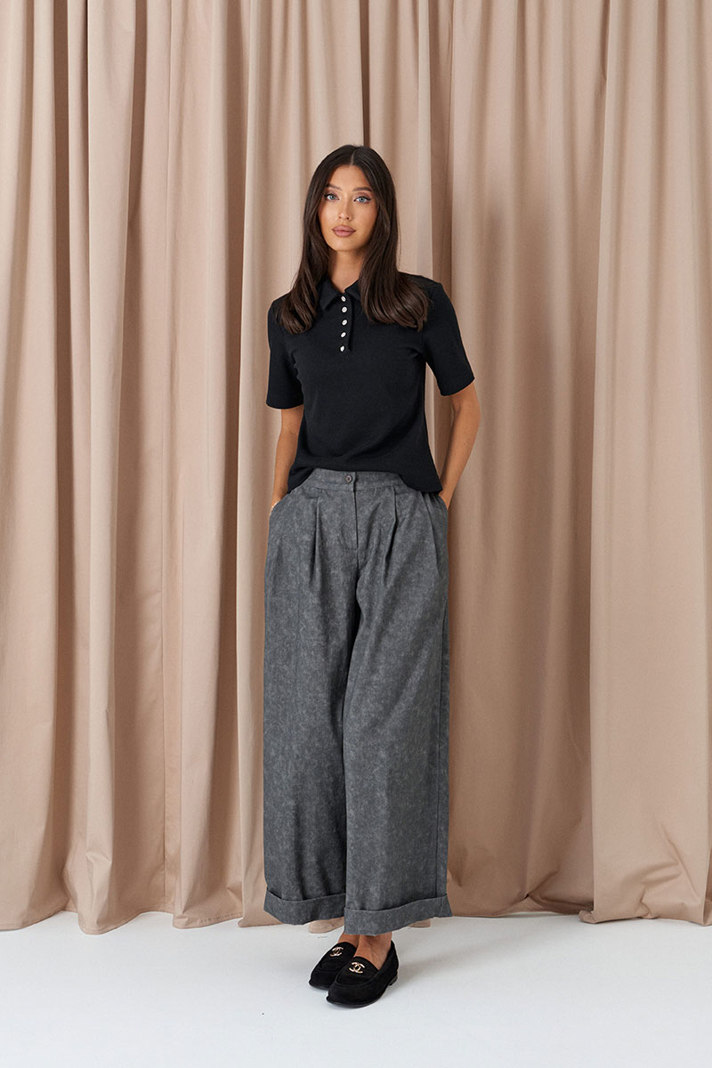 Брюки свободного кроя. Выполнены из денима серого цвета с имитацией потёртости. Пояс стабильный по переду, на резинке по спинке. Застёжка центральная пуговица, молния. От пояса складки. Из боковых швов карманы. По заднему полотну имитация карманов с клапанами.