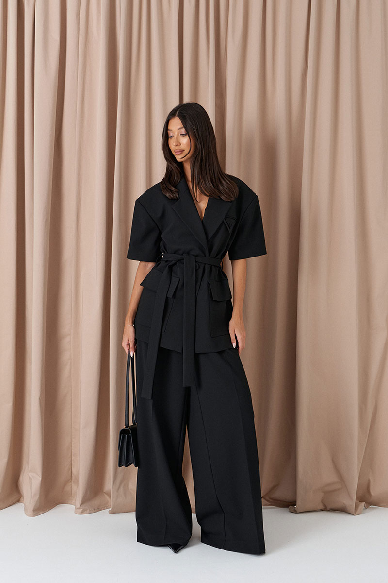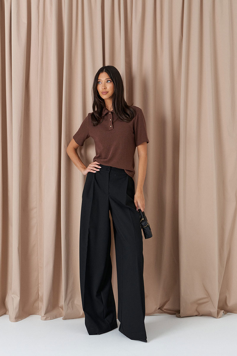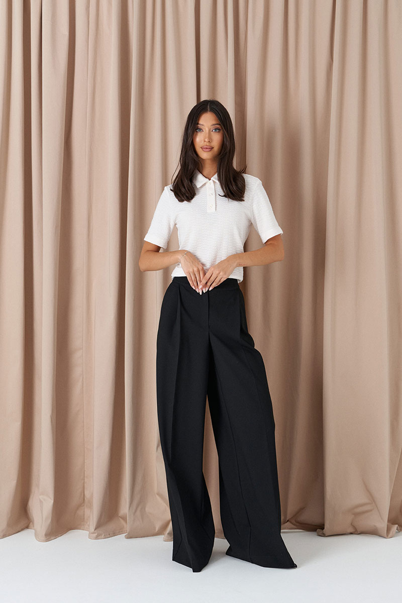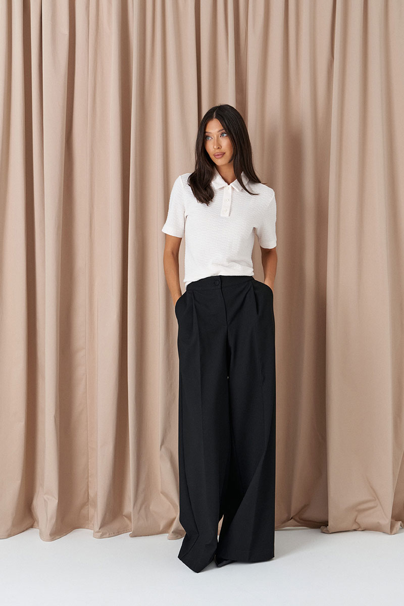 Брюки-палаццо свободного кроя. Выполнены из текстильного полотна черного цвета. В боковых швах карманы с отрезным бочком. Стабильный пояс без шлевок. По передузастежка молния и пуговица.