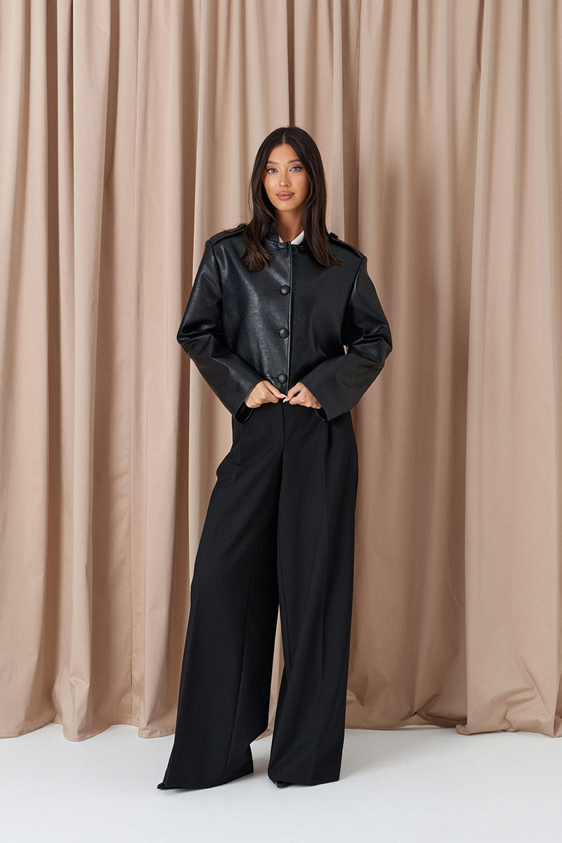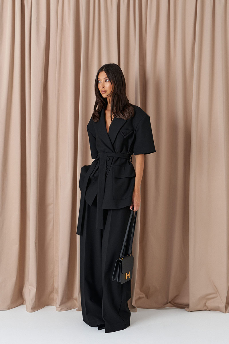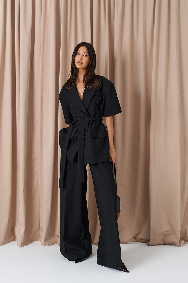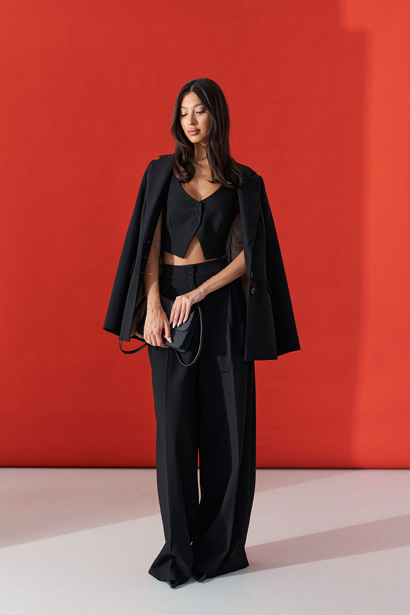 Брюки-палаццо свободного кроя. Выполнены из текстильного полотна черного цвета. В боковых швах карманы с отрезным бочком. Стабильный пояс без шлевок. По передузастежка молния и пуговица.