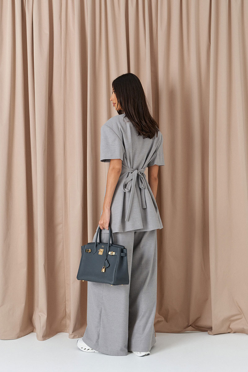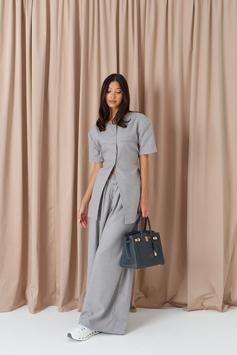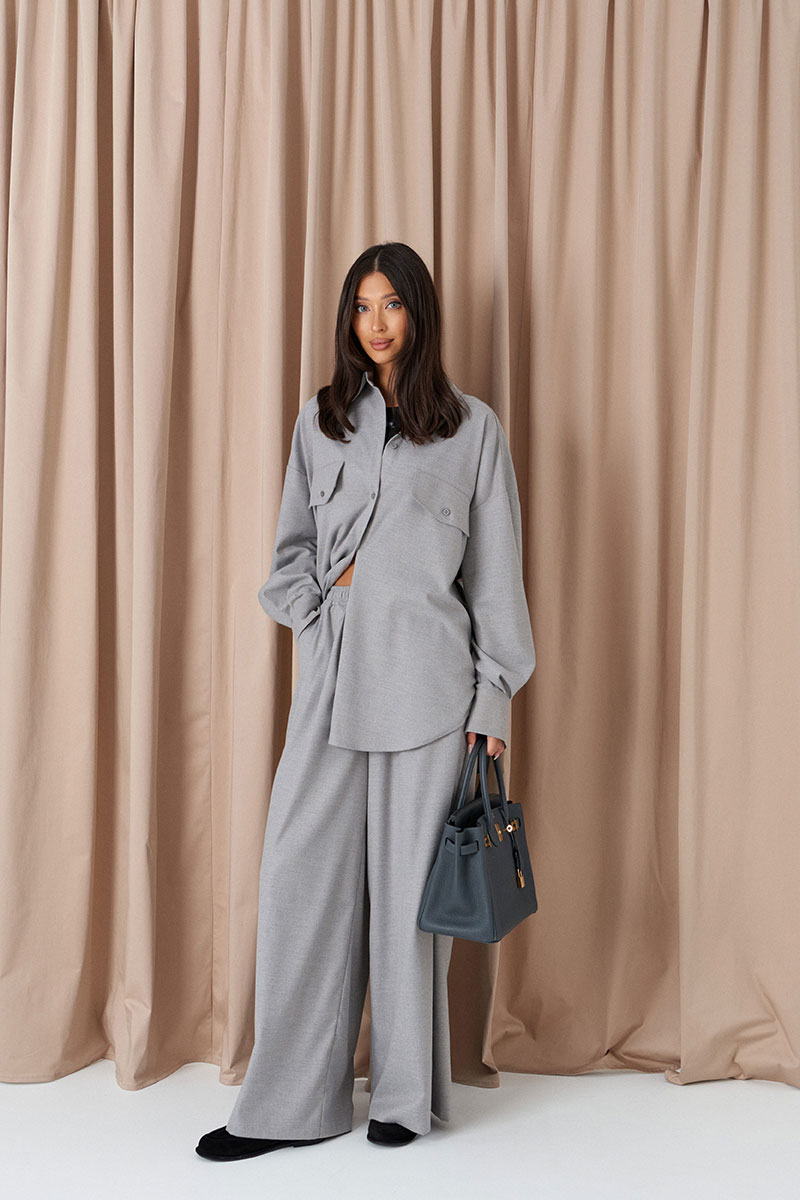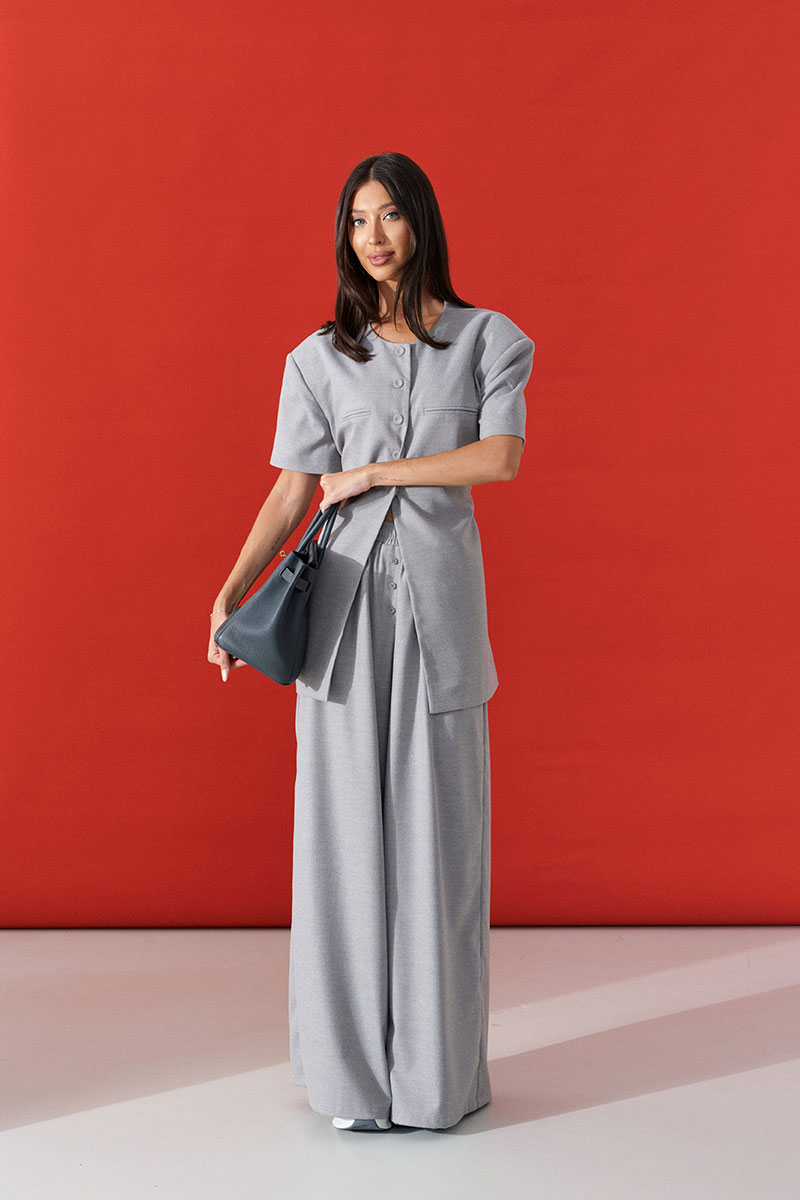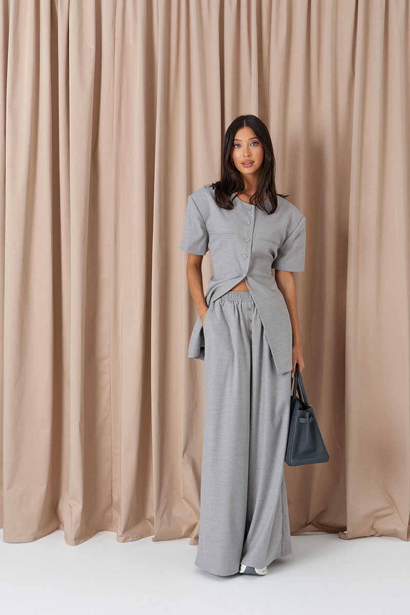 Брюки свободного кроя. Выполнены из костюмной ткани светло-серого цвета. В боковых швах карманы с отрезным бочком. Пояс на резинке. На Поясе имеются декоративные строчки. По переду имеется имитация застёжки.