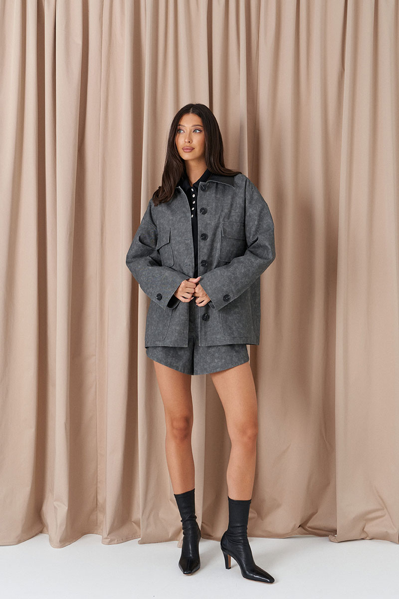 Шорты свободного кроя выполнены из ткани графитового цвета. Характеристики: прямой крой, брендированная подкладка, пояс стабильный, застежка молния пуговичка, боковые карманы.