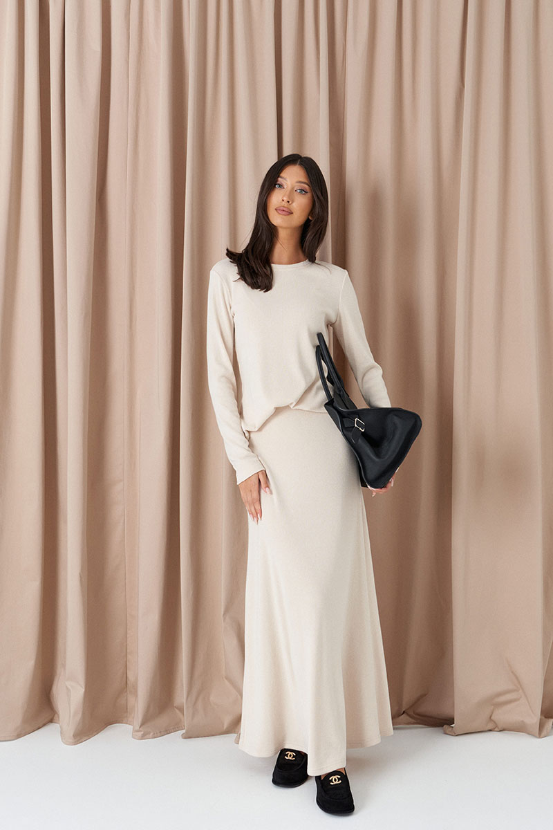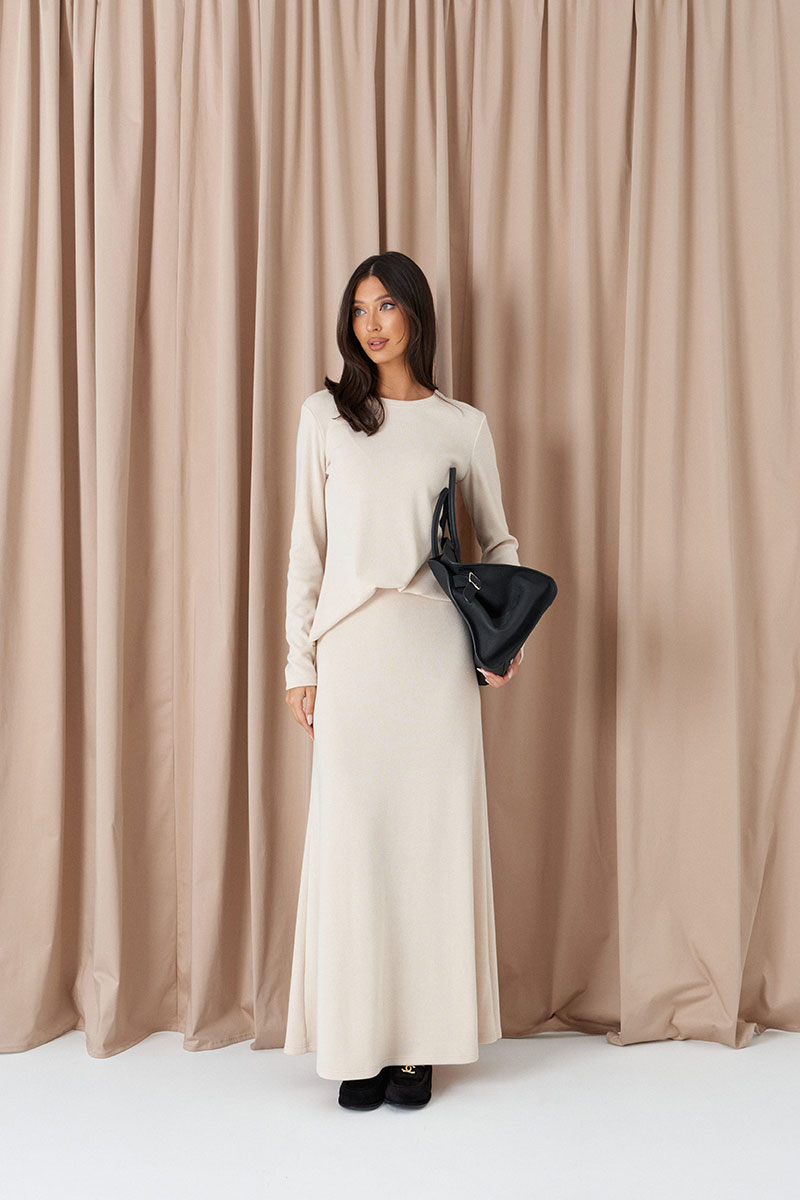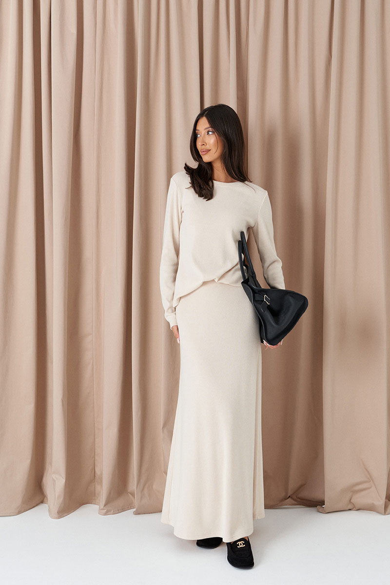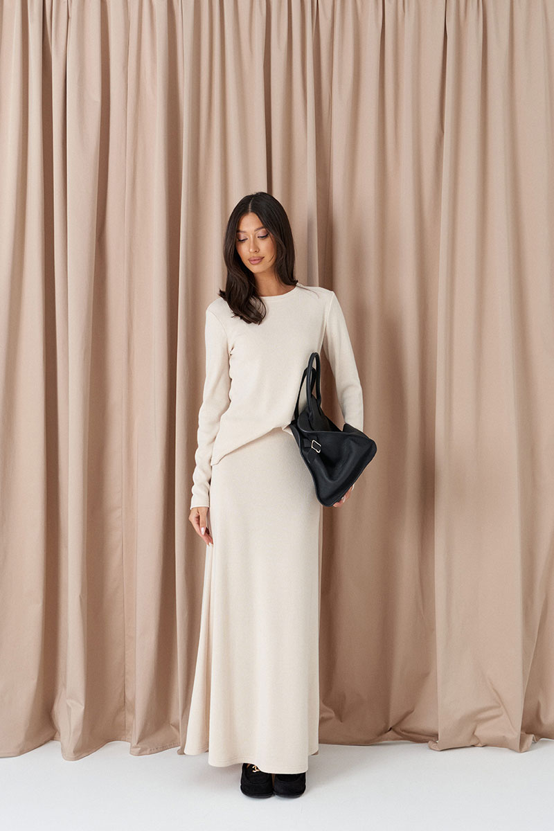 Юбка свободного кроя, выполнена из трикотажа молочного цвета. Характеристики: свободный крой, пояс на резинке, эластичная ткань, без подклада.