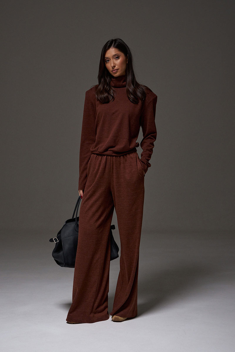 Брюки прямого свободного кроя, выполены из трикотажного полотна в шоколадном оттенке. Характеристики: прямой крой, узкий пояс на резинке с кулиской, в боковых швах карманы.