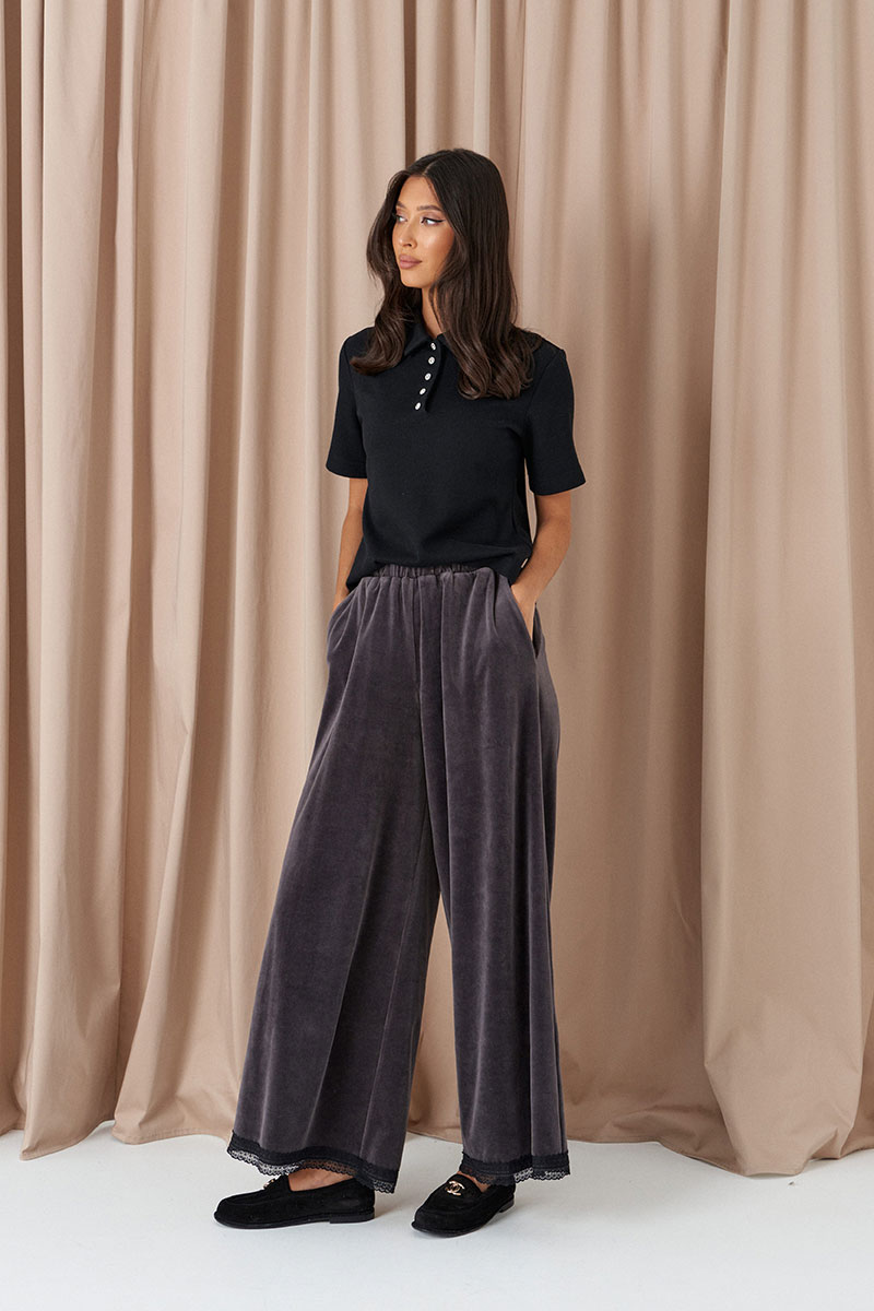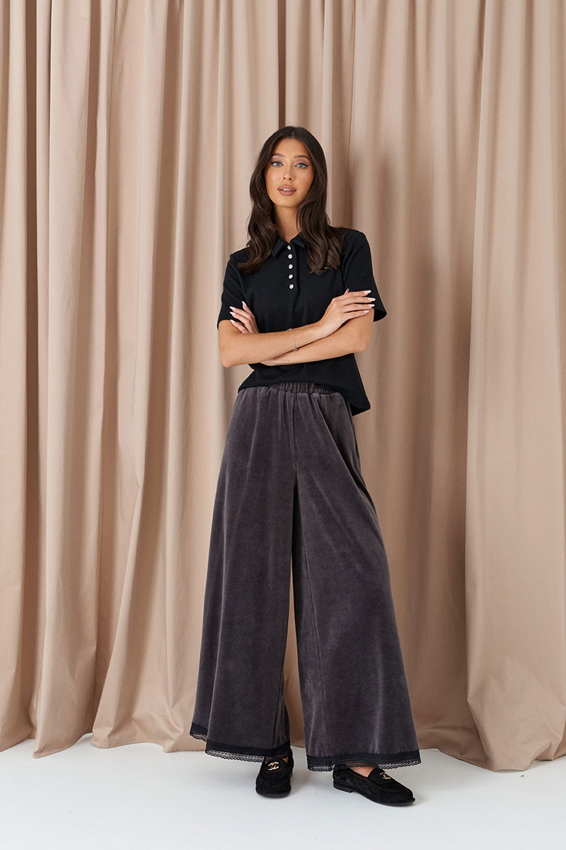 Брюки свободного кроя, выполнены из мягко полотна велюра графитового цвета. Характеристика: свободный корой, пояс на резинке, по низу брюк черное кружево.