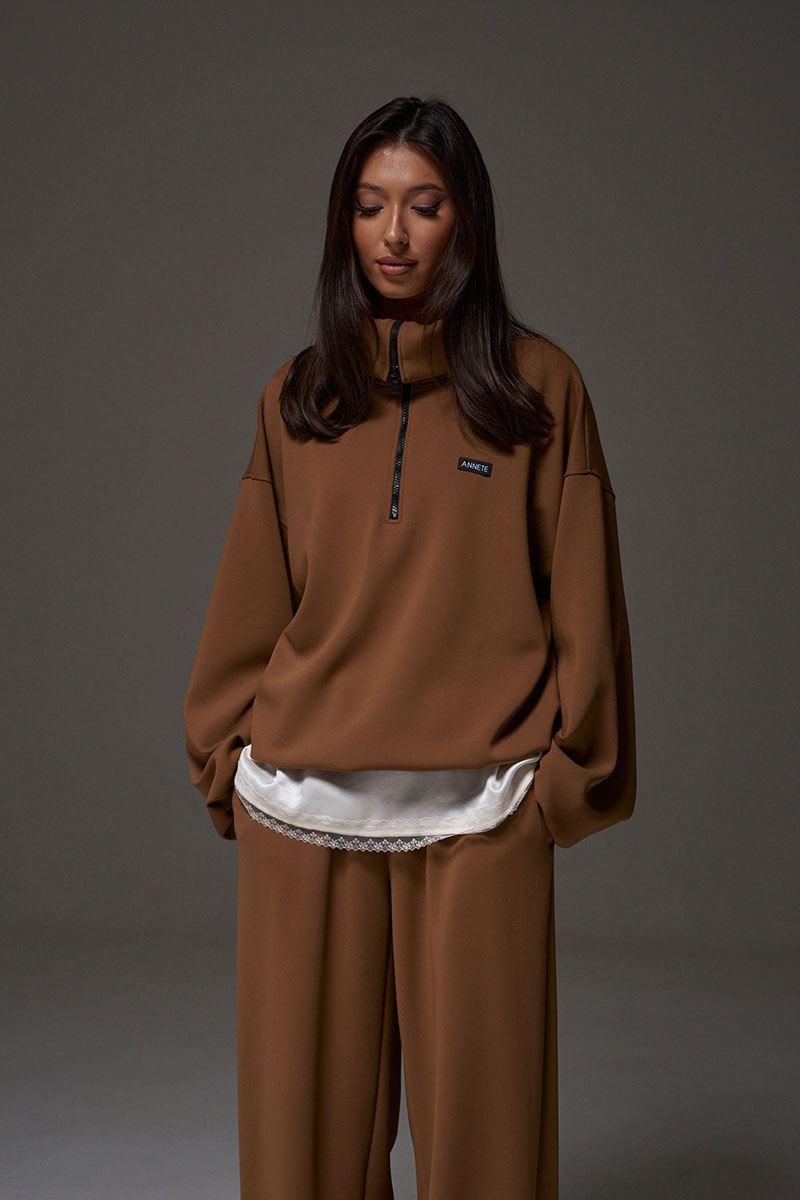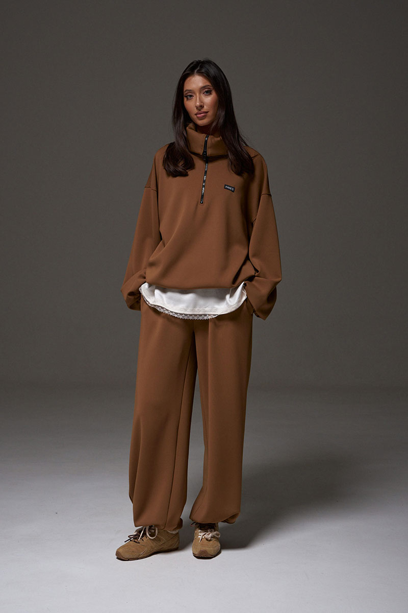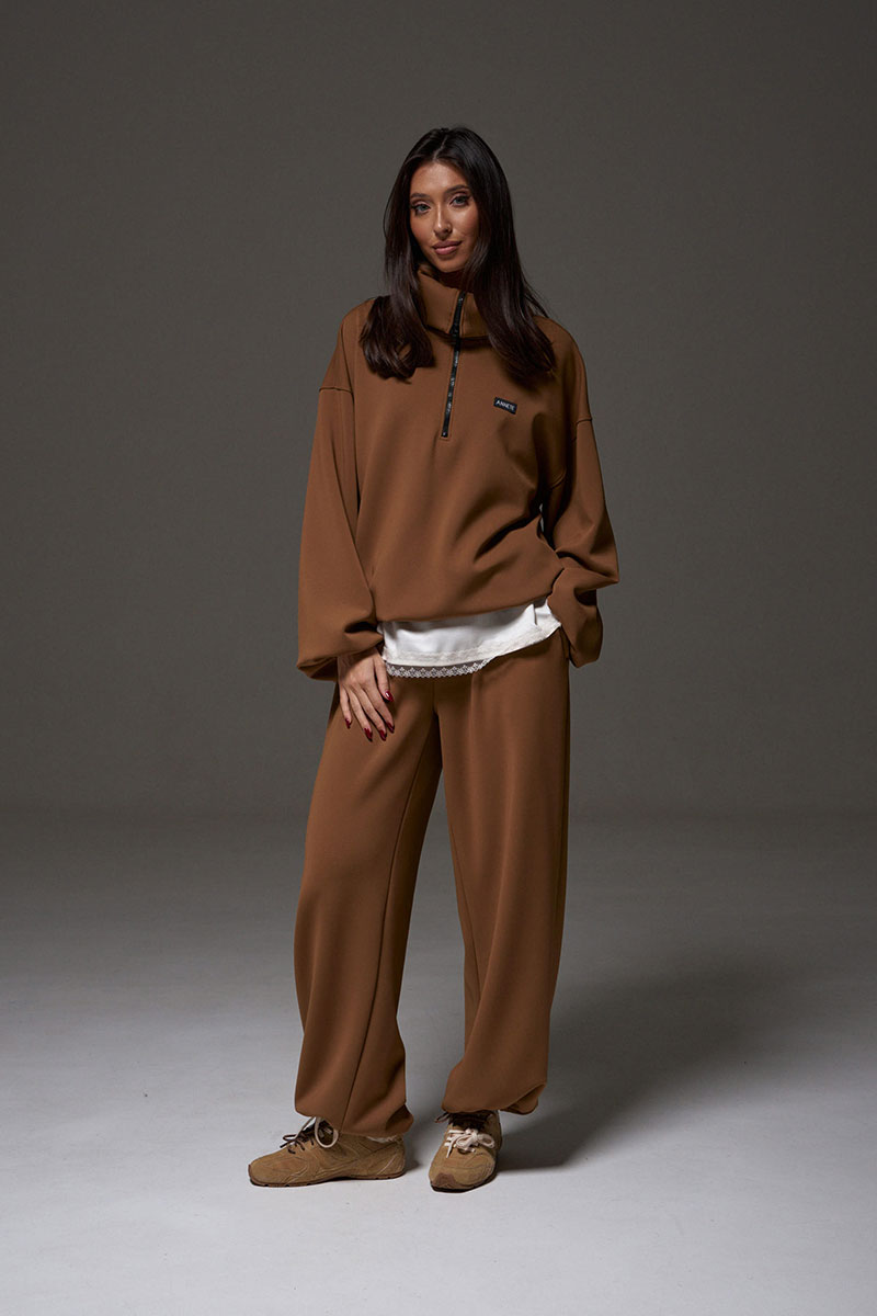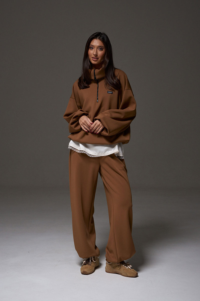 Брюки выполнены из трикотажного полотна кофейного цвета. Характеристики: прямой крой, пояс на резинке с кулиской, в боковых швах карманы, накладные карманы на задней части брюк, штанина внизу на резинке с фиксатором.
