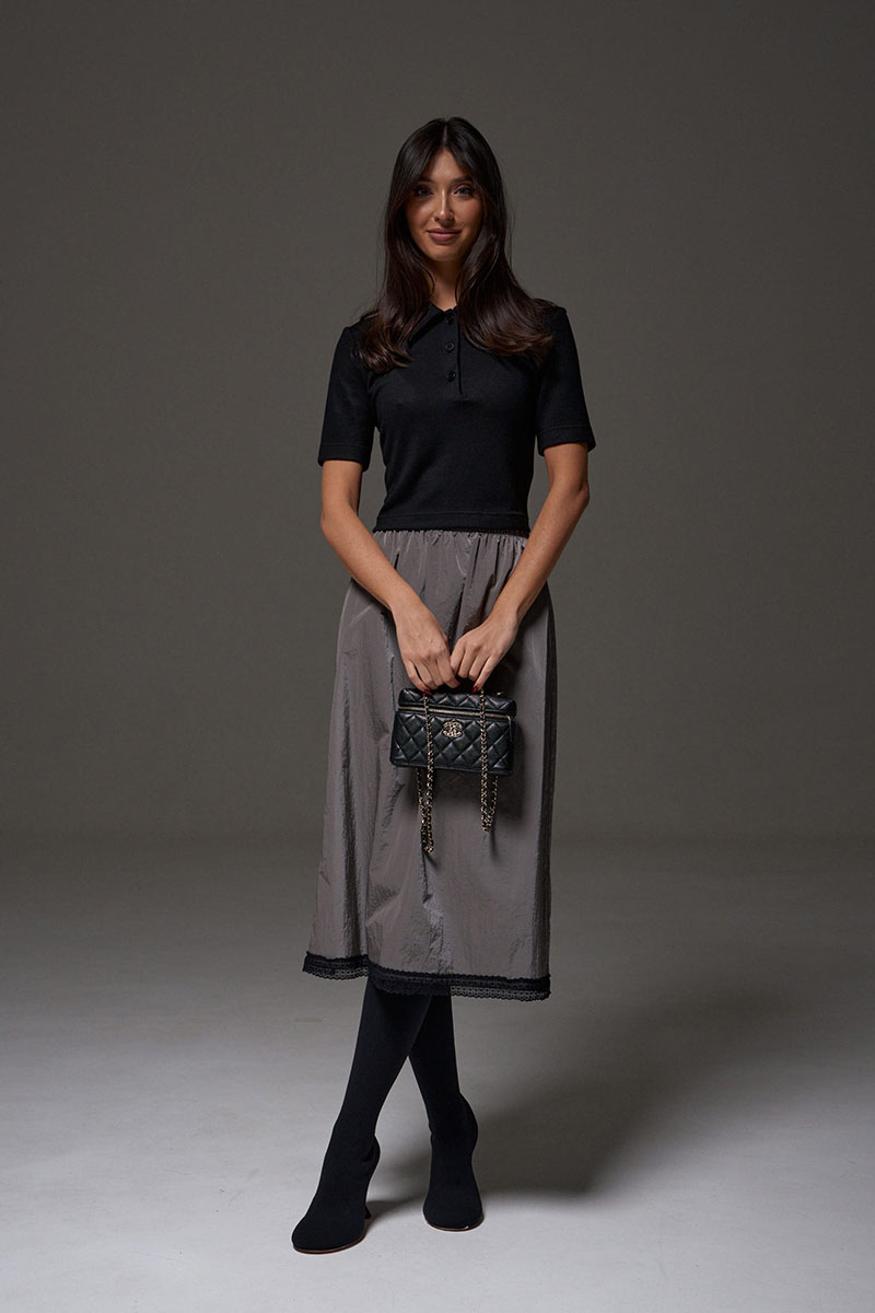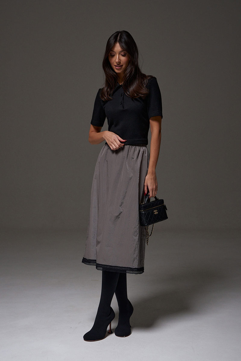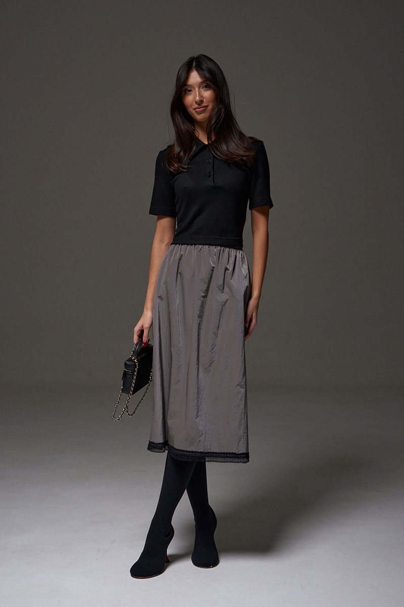 Юбка полуприлегающего силуэта выполнена из ткани плащевки на брендированной подкладе. Характеристики: полуприлегающий силуэт, пояс на резинке, по низу изделия пришито кружево.