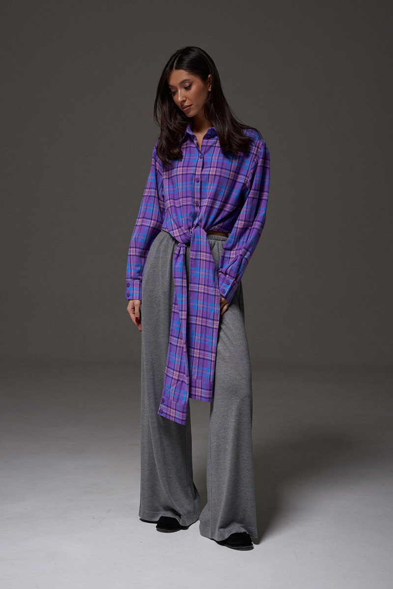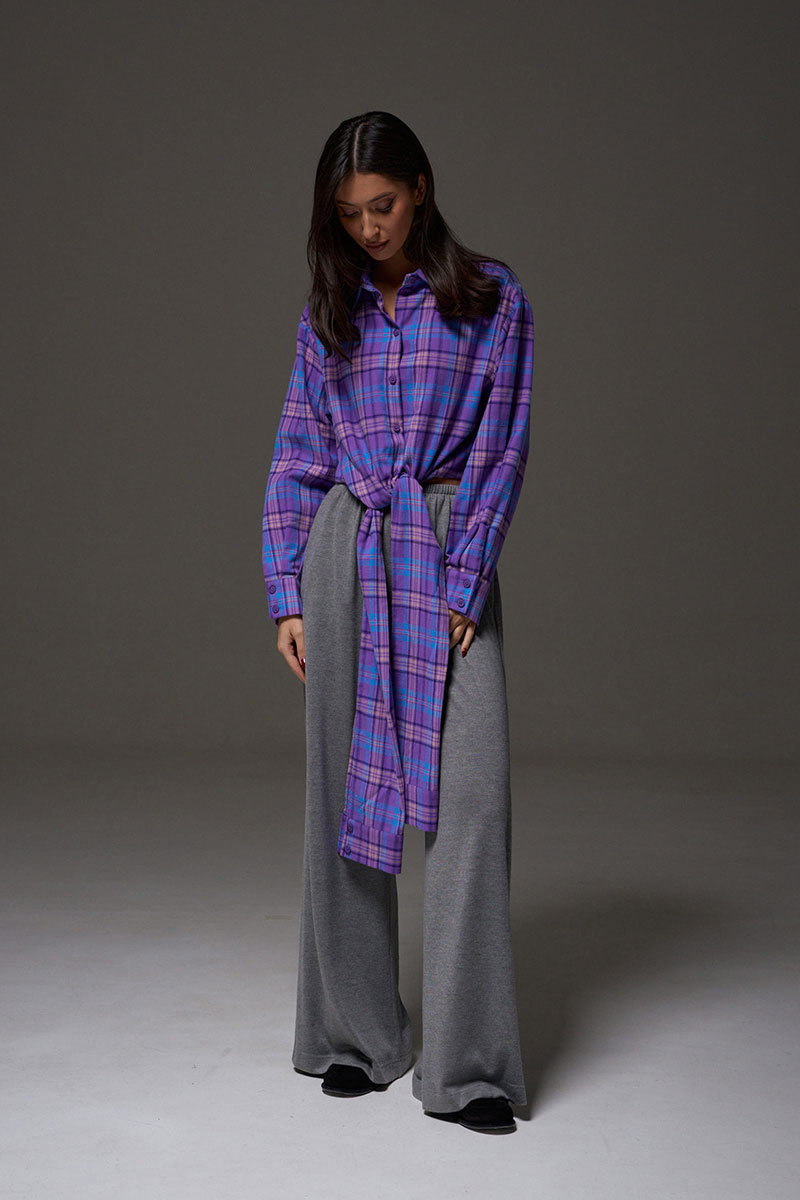 Брюки прямого, свободного кроя выполнены из трикотажного полотна серого цвета. Характеристики: прямой крой, пояс на резинке, в боковых швах карманы.