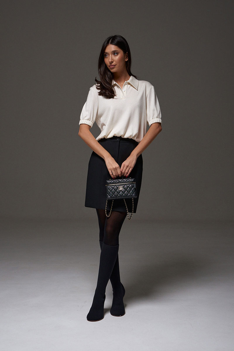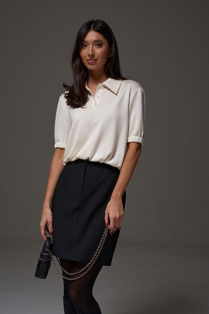 Юбка прямого кроя выполнена из текстильного полотна черного цвета. Характеристики: прямой крой, брендированная подкладка, пояс стабильный, застежка молния и пуговичка, по передней и задней части изделия вертикальные прямые рельефы.