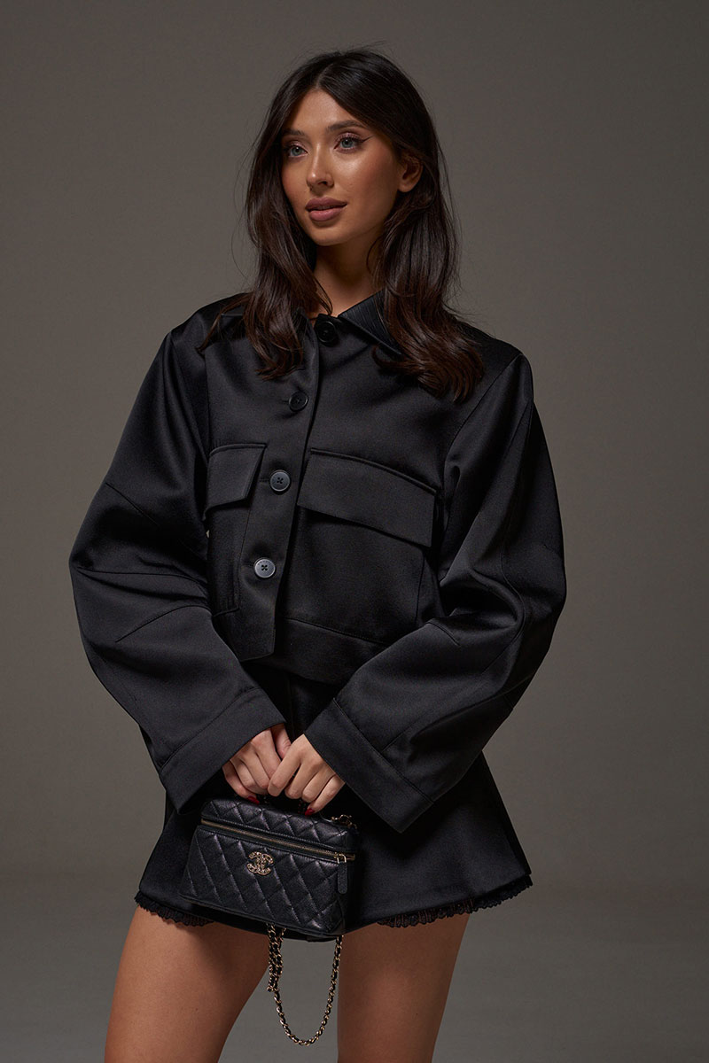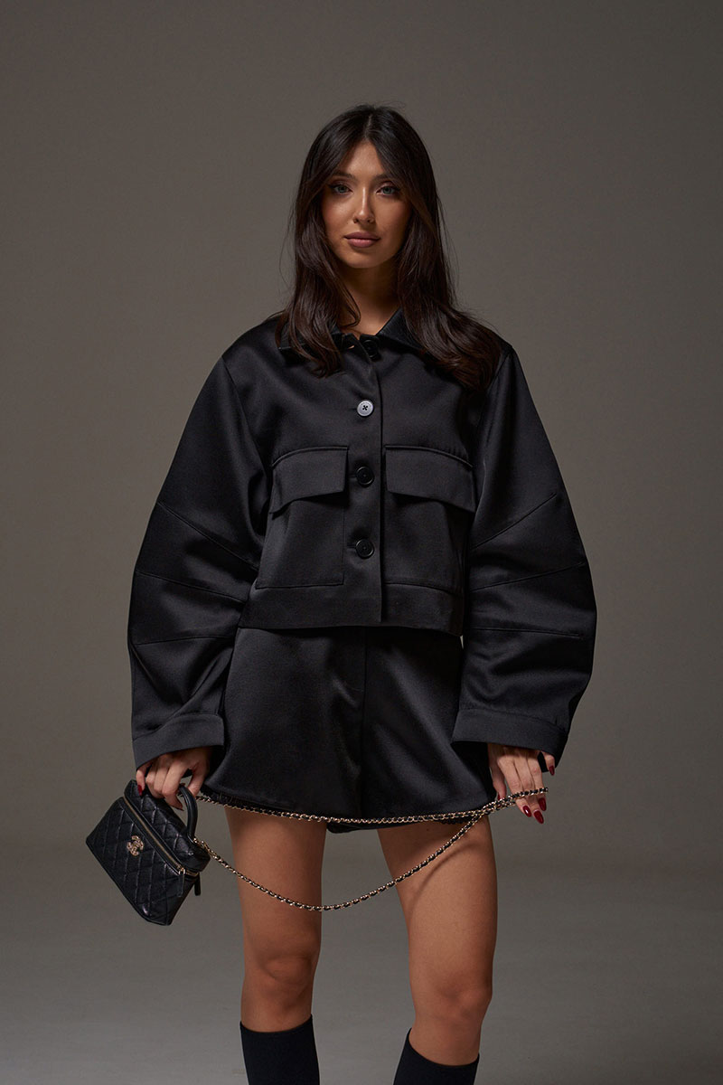 Шорты свободного кроя выполнены из костюмной ткани черного цвета с блеском. Характеристика: стабильный пояс, засежка молния и петля-пуговица, по низу изделия нашито декоративное кружево черного цвета, в боковых швах карманы, брендированная подкладка.