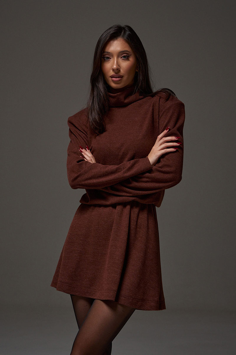 Юбка прямого кроя, выполнена из трикотажного полотна в шоколадном оттенке. Характеристики: прямой крой, подкладка, пояс на резинке.