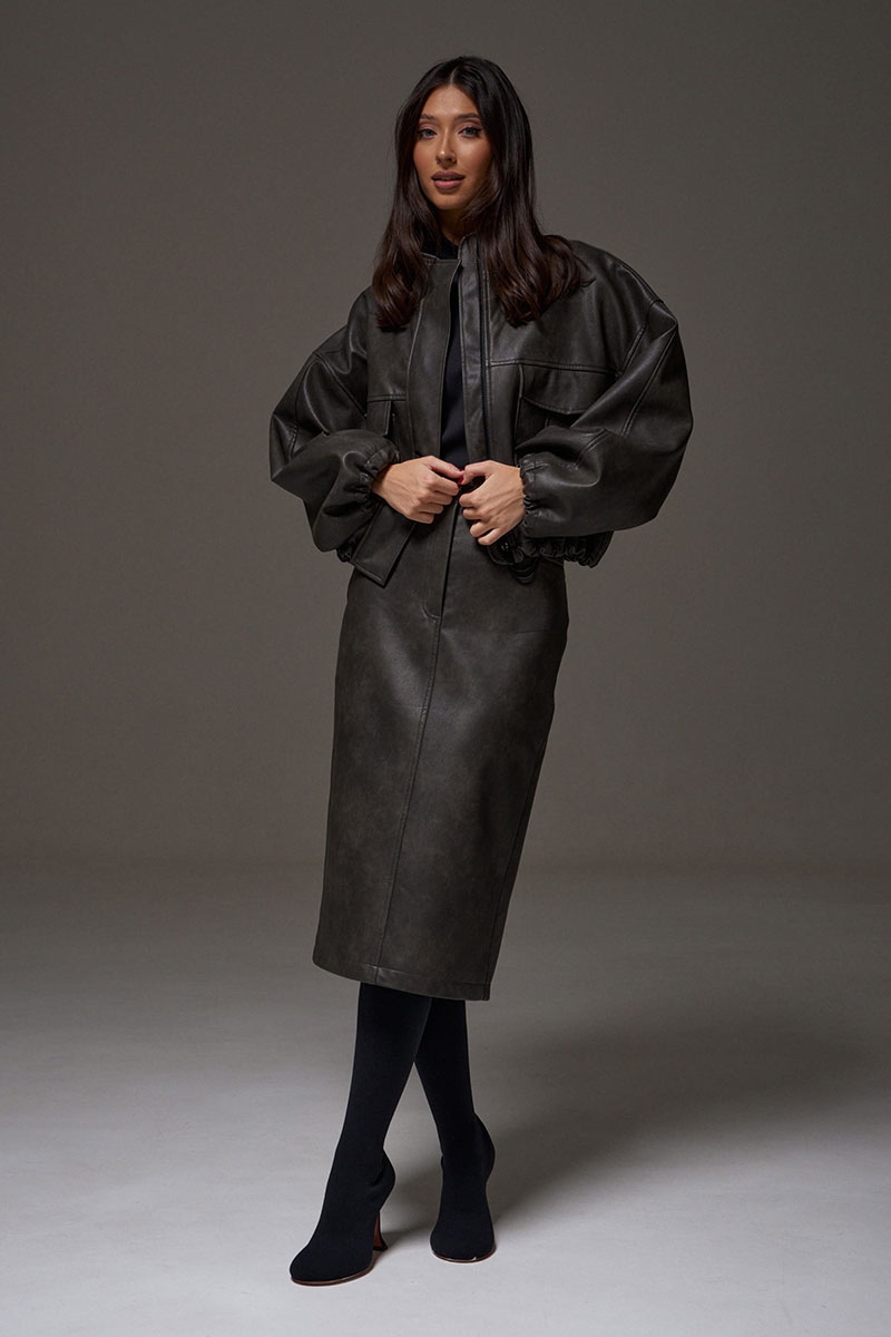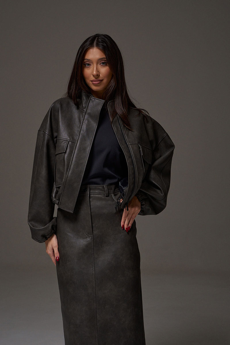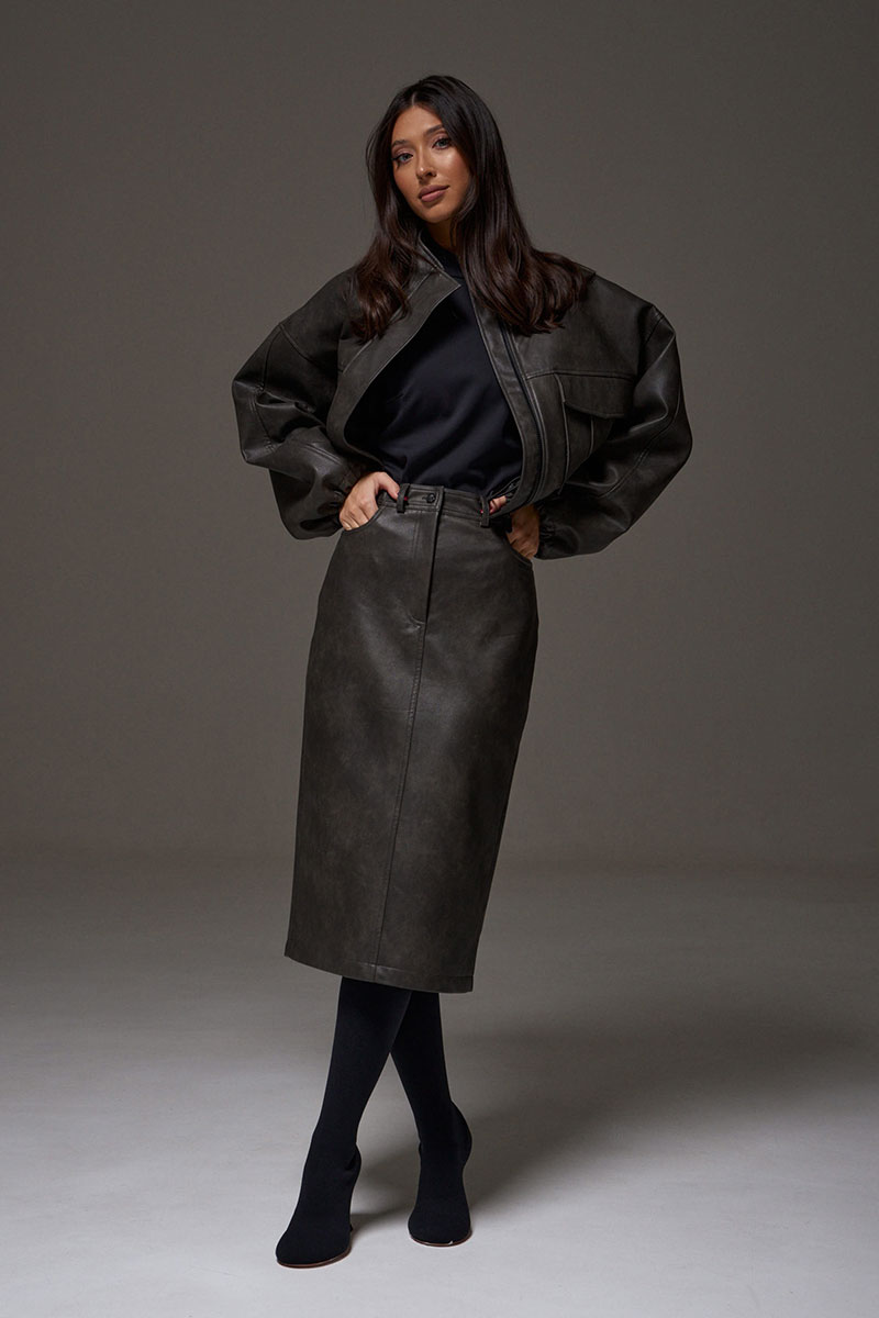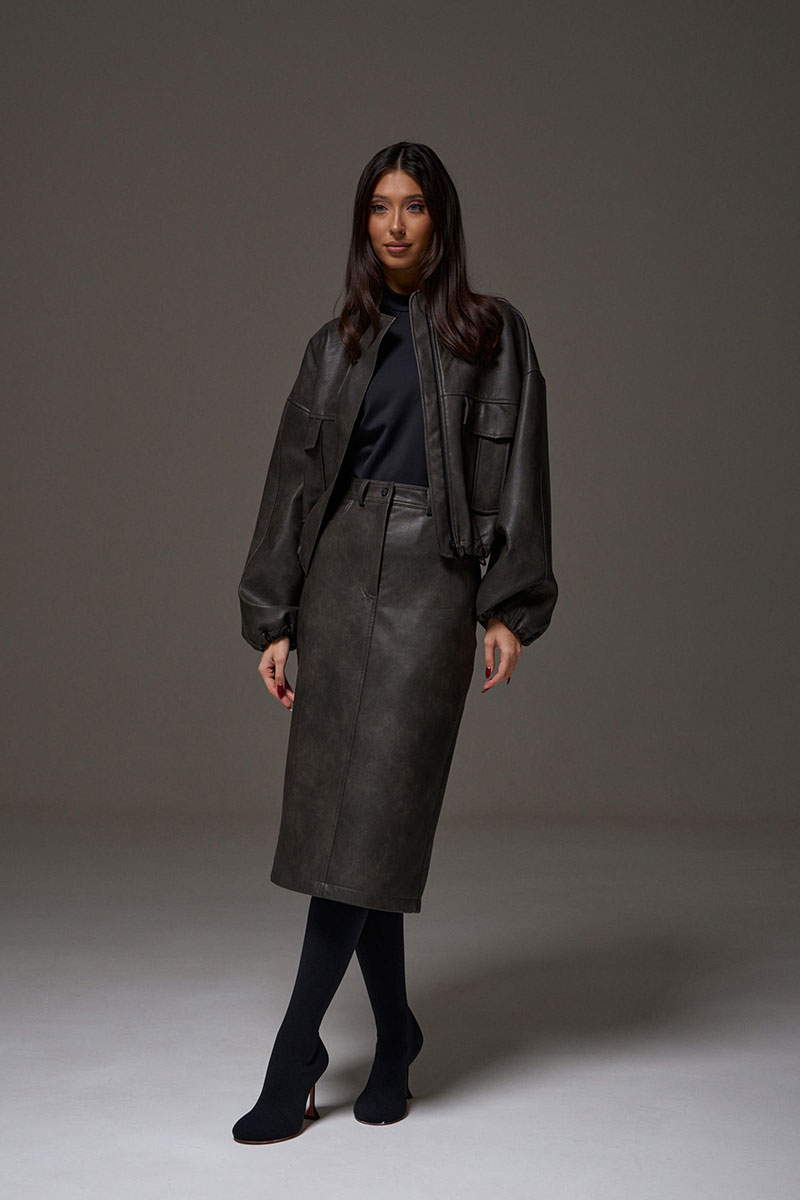 Юбка прямого кроя выполнена из экокожи. Характеристики: прямой крой, пояс стабильный со шлевками, на брендированной подкладке, застёжка центральная пуговица, молния, по передней части изделия прорезные карманы, по заднему полотну накладные карманы. В среднем шве разрез 32 см.