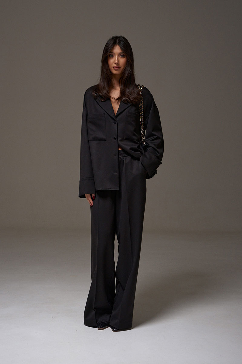 Брюки прямого кроя, выполнены из костюмной ткани черного цвета. В боковых швах карманы с отрезным бочком. Пояс на резинке. По переду изделия имитация застёжки с пришитыми пуговицами. По передней и задней части брюк заутюженные стрелки.