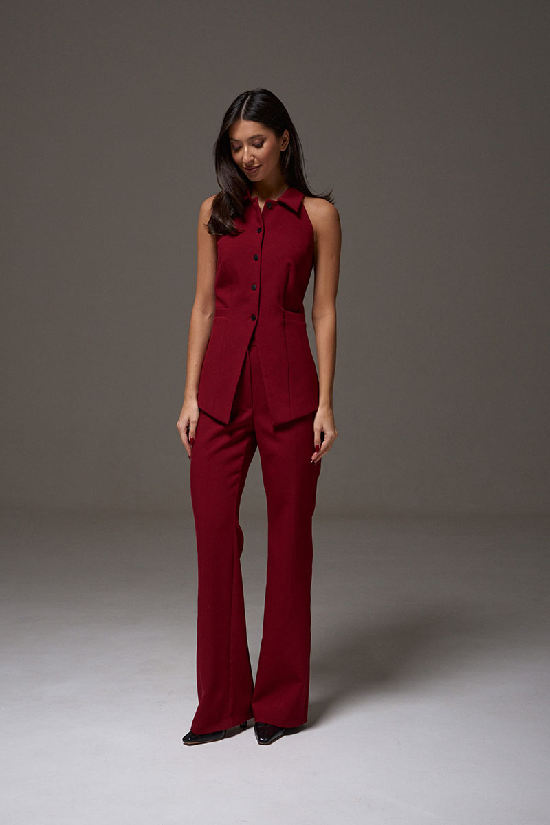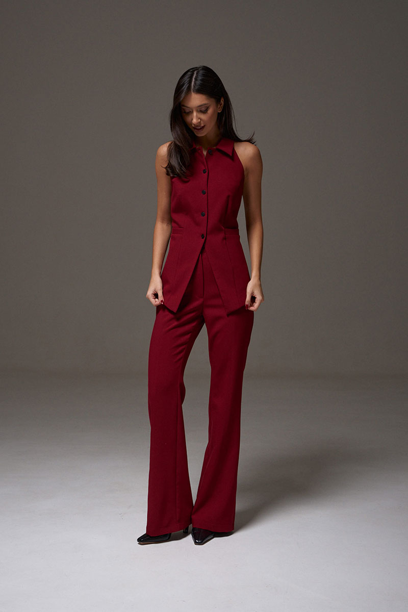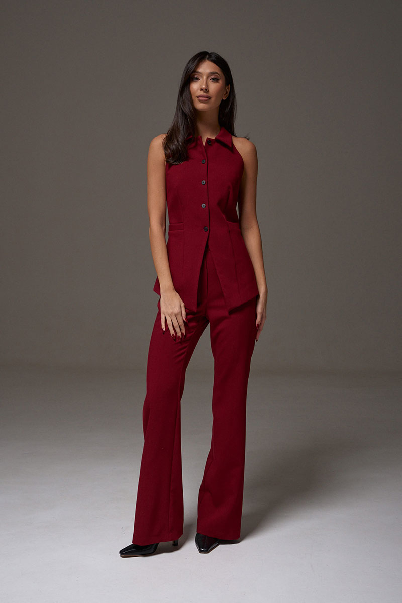 Брюки полуприлегающего силуэта с разведением к низу. Характеристики: полуприлегающий силуэт, пояс стабильный, по переднему и заднему полотну брюк стрелки, по заднему полотну прорезные кармашки «обманки».