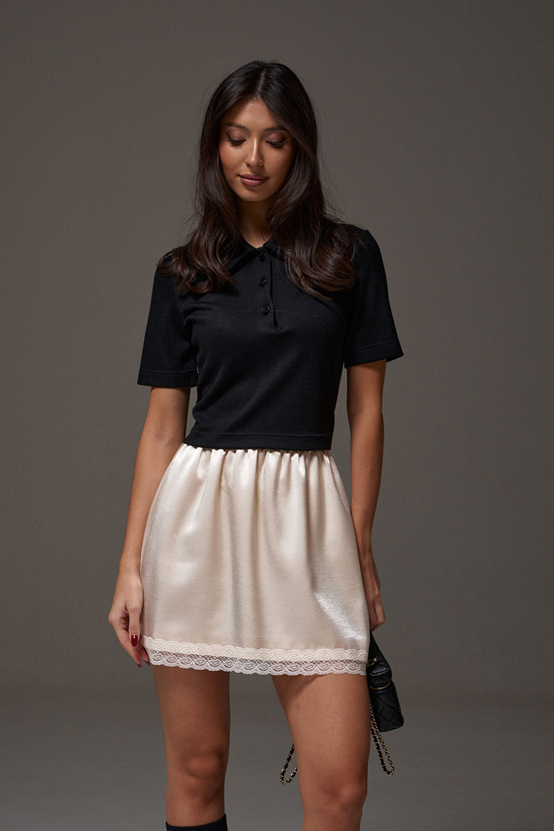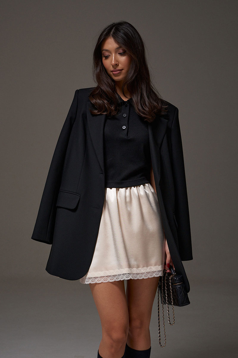 Юбка прямого кроя, выполнена из струящейся ткани молочного цвета. Характеристики: прямой крой, на подкладке, пояс на резинке, по низу изделия пришито кружево.