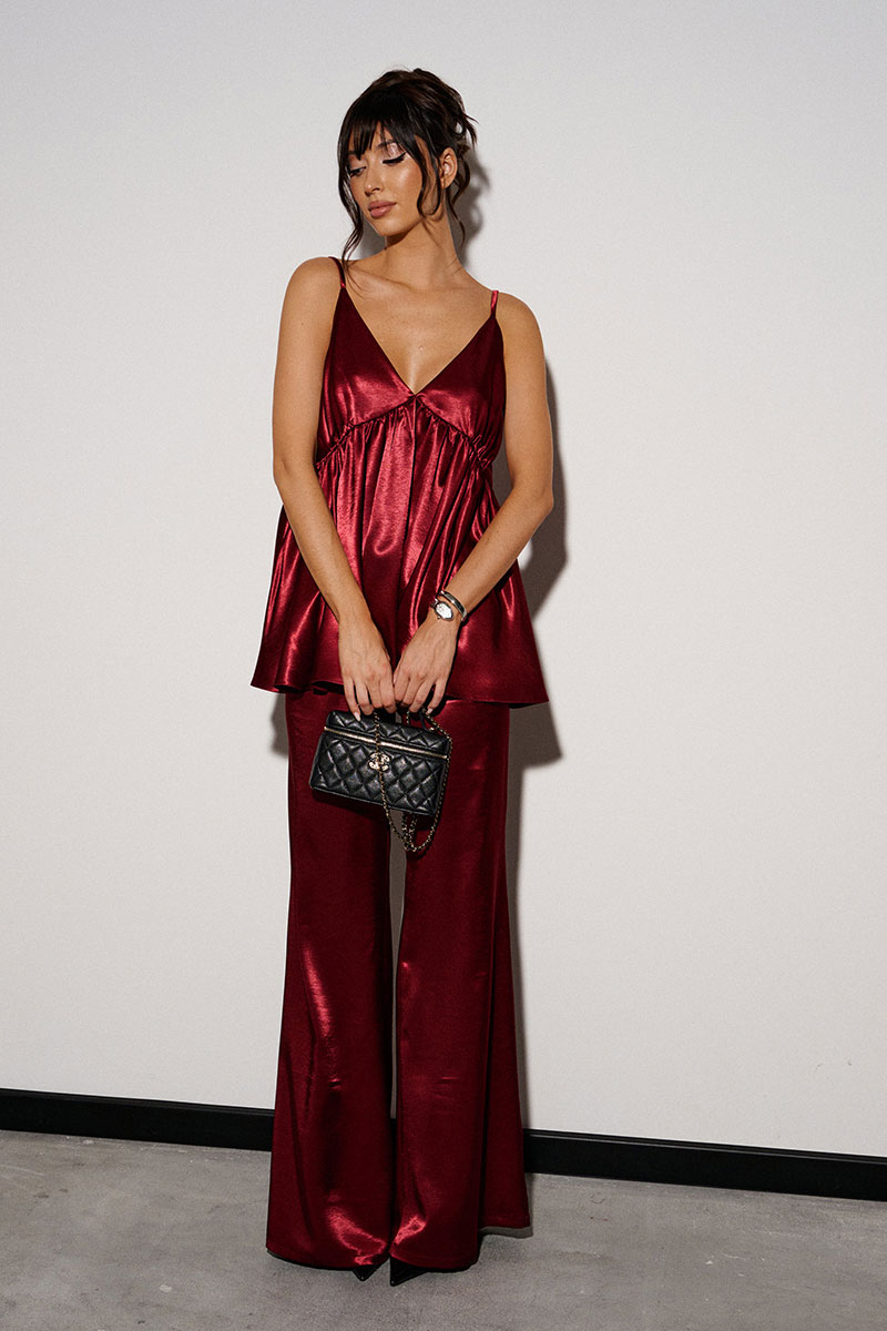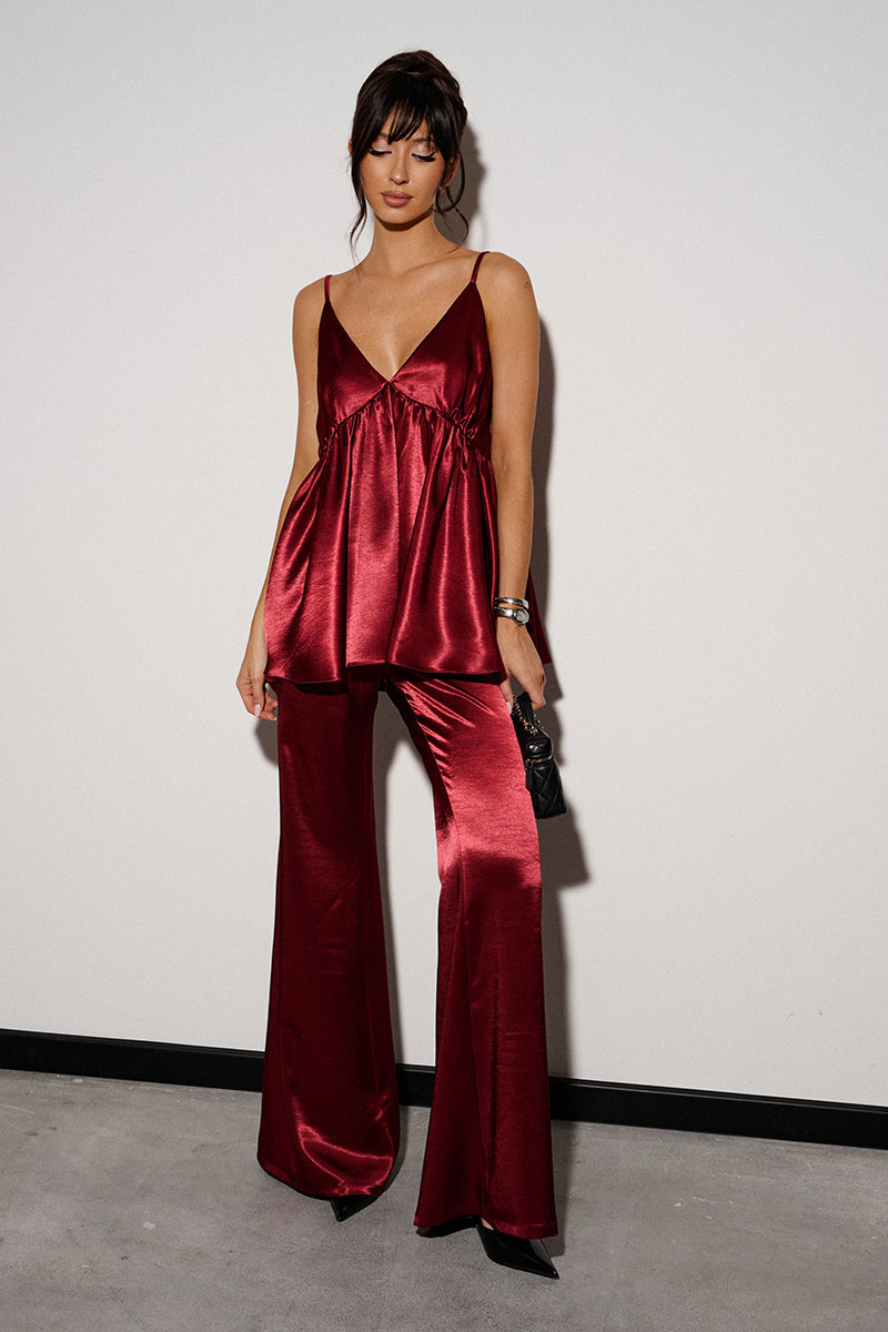 Брюки прямого свободного кроя. Выполнены из мягкой струящейся ткани бордового цвета. Пояс на резинке. Карманов нет.
