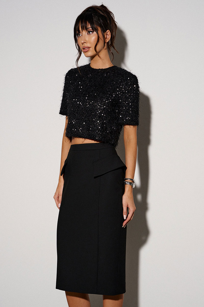 Юбка-миди. Выполнена из костюмной ткани чёрного цвета. С подкладкой. Прилегающий силуэт. Пояс стабильный. По боковым частям декоративные клапаны. Застёжка в среднем шве заднего полотна изделия - молния. Шлица из среднего шва заднего полотна (26 см).