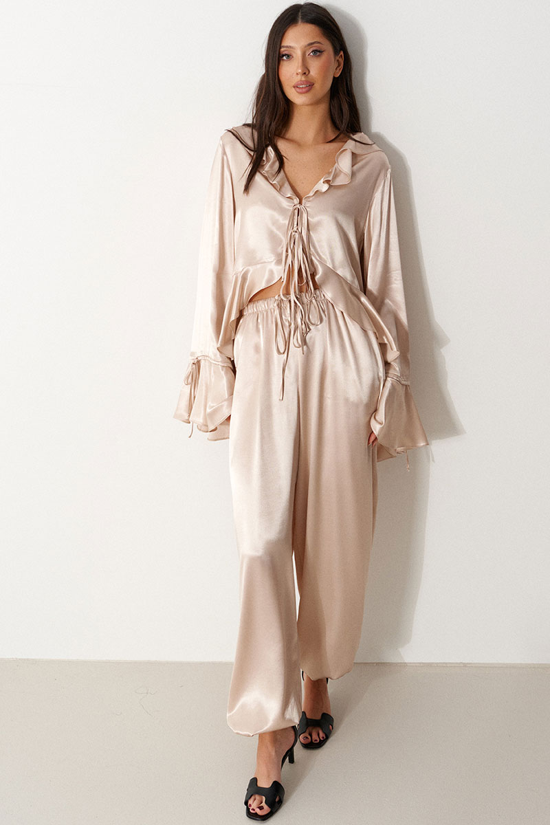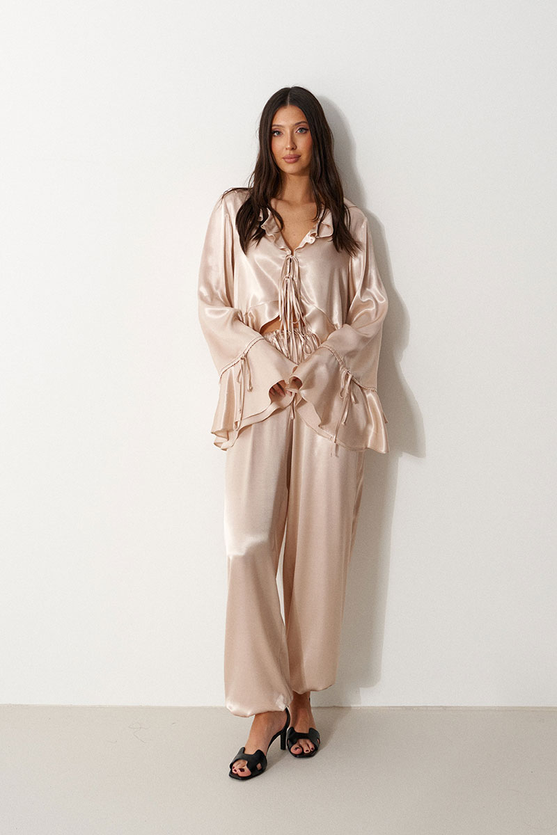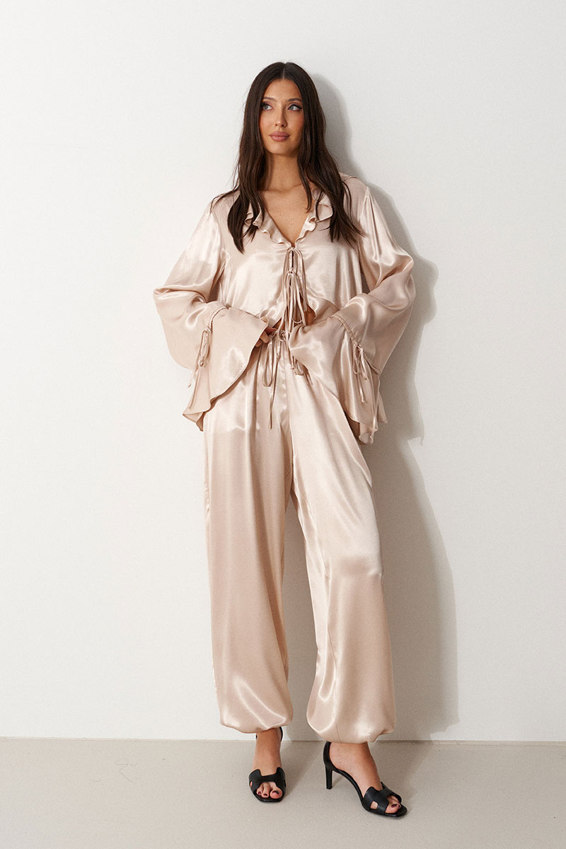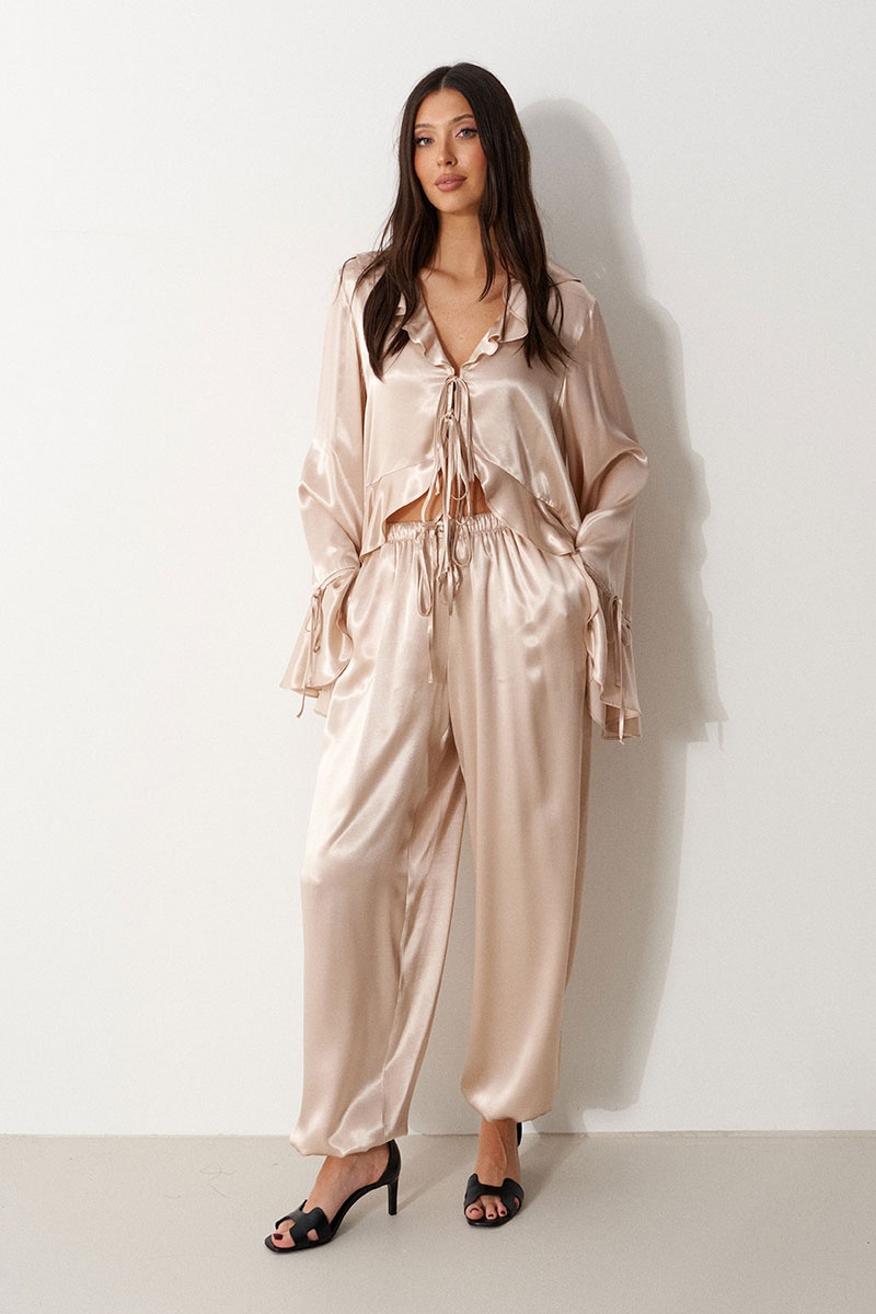 Брюки-джоггеры, выполнены из мягкого струящегося полотна телесного цвета. Характеристики: прямой крой, пояс на резинке, в боковых швах карманы, штанина внизу на резинке с фиксатором.