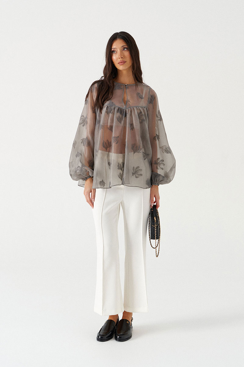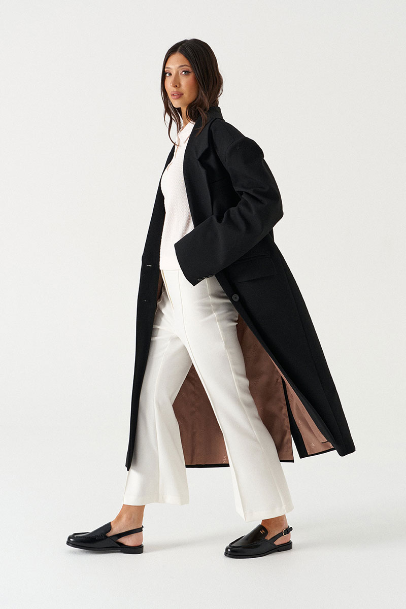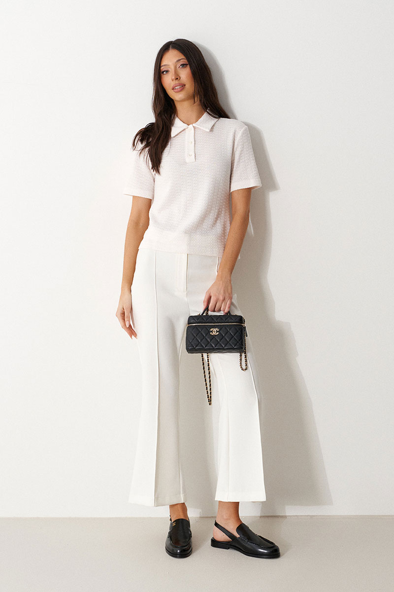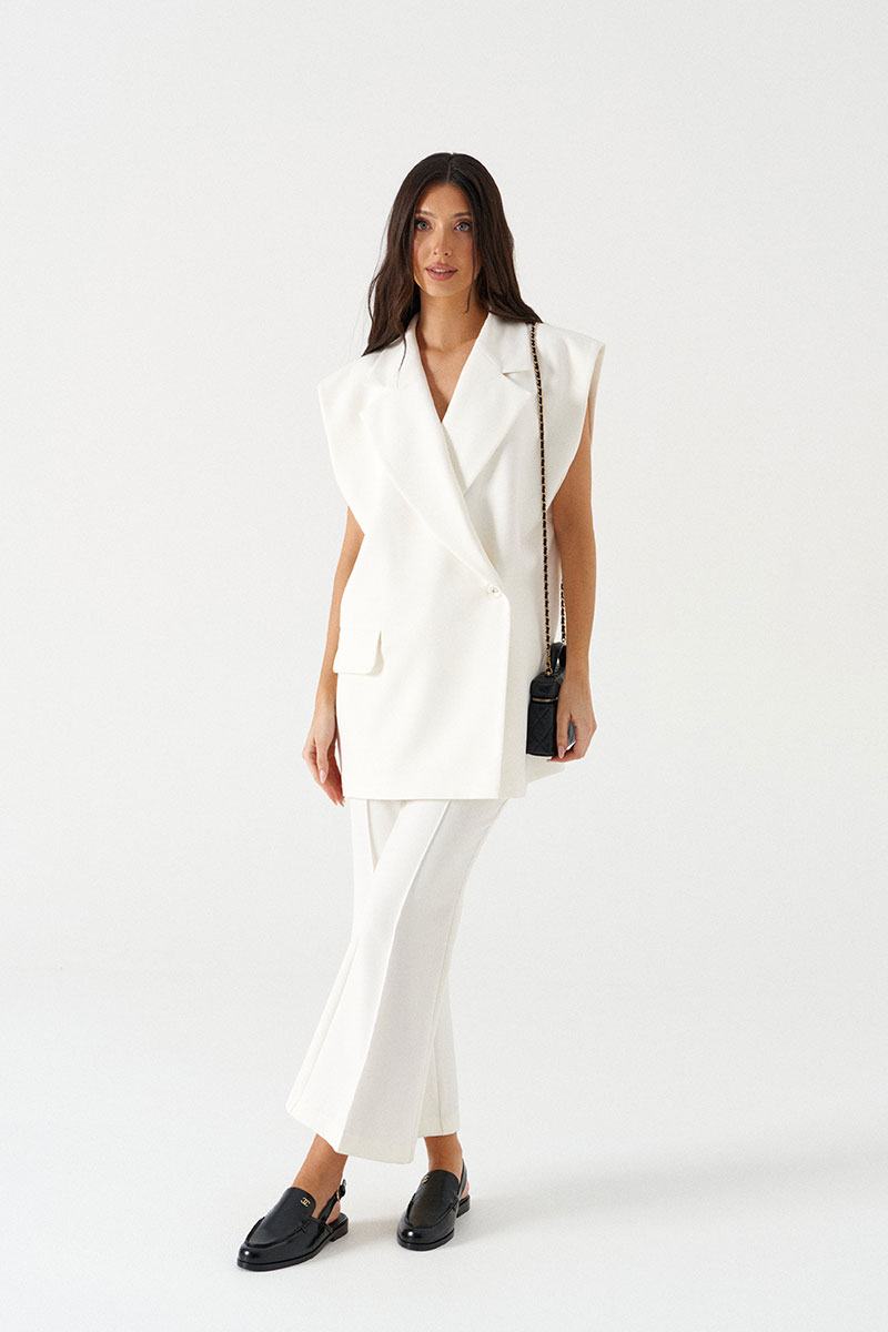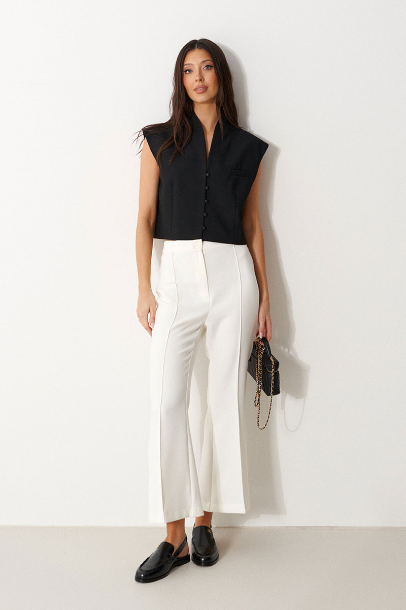 Брюки облегающего силуэта, расклешенные к низу, укороченные, выполнены из костюмной ткани молочного цвета. Характеристика: На задних частях брюк обработаны талиевые вытачки и заутюжены и отстрочены стрелки. По передней части заутюжены и отстрочены срелки. Застежка молния брючного типа с гульфиком и откоском. Пояс стабильный застегивающийся на петлю, пуговицу.
