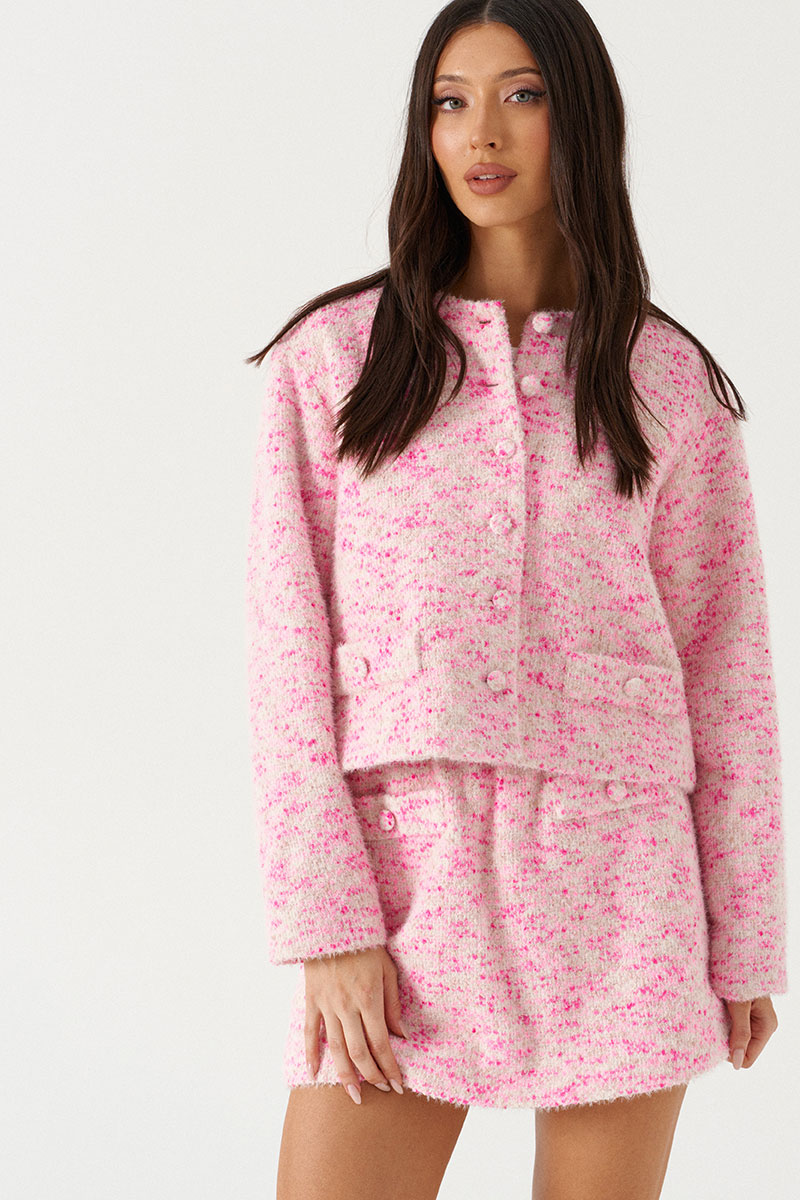 Юбка кроя-трапеция, выполнен из твидовой ткани бежево-розового цвета. Характеристика: крой трапеция, пояс на скрытой резинке, брендированный подклад, спереди изделия имитация карманов.
