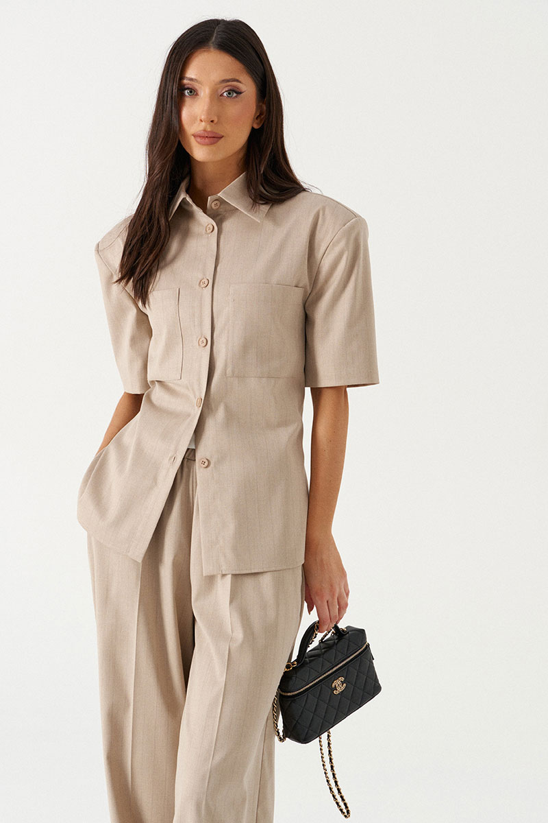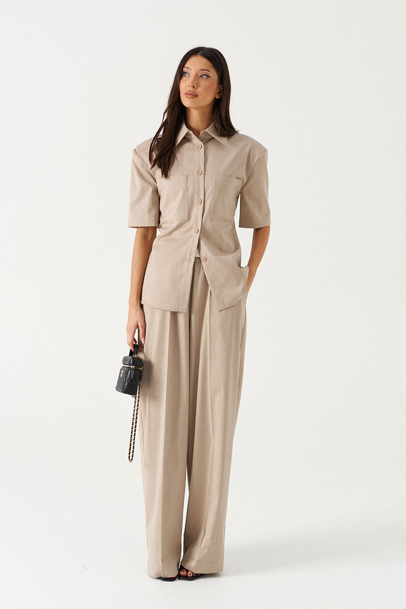 Брюки прямого кроя выполнены из текстильной тонкой ткани бежевого цвета в узкую полоску. Характеристики: прямой крой, пояс на широкой резинке, боковые карманы, на передних и задних частях брюк заутюжены стрелки, без подкладки.