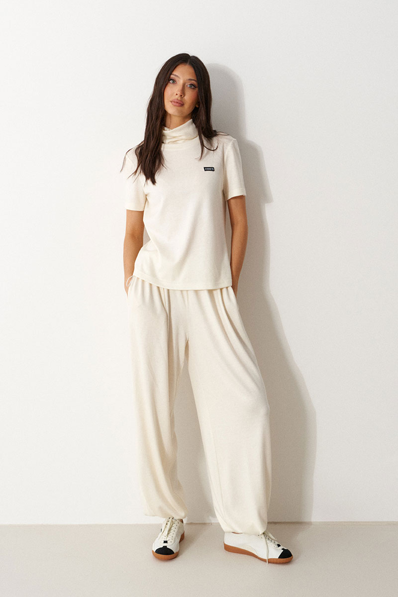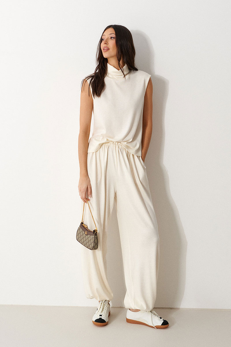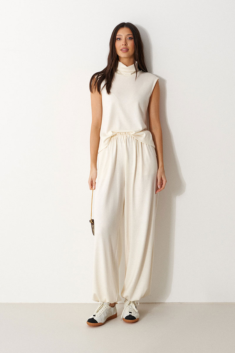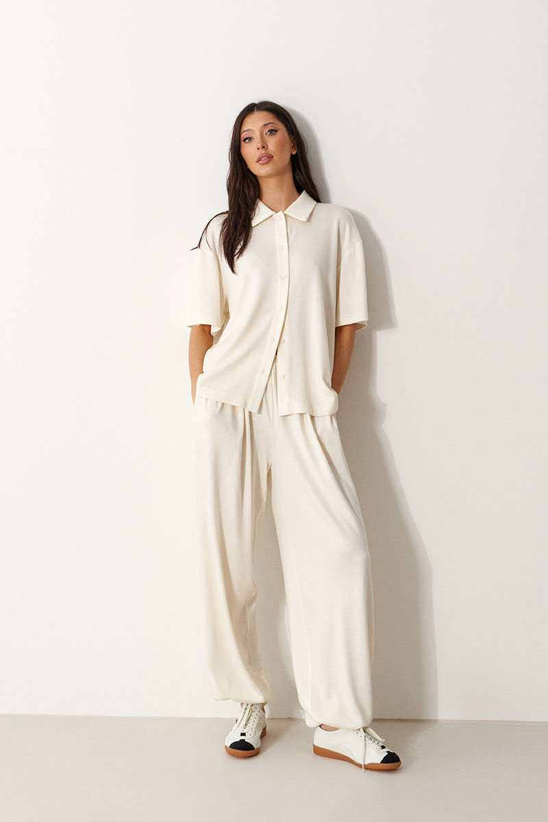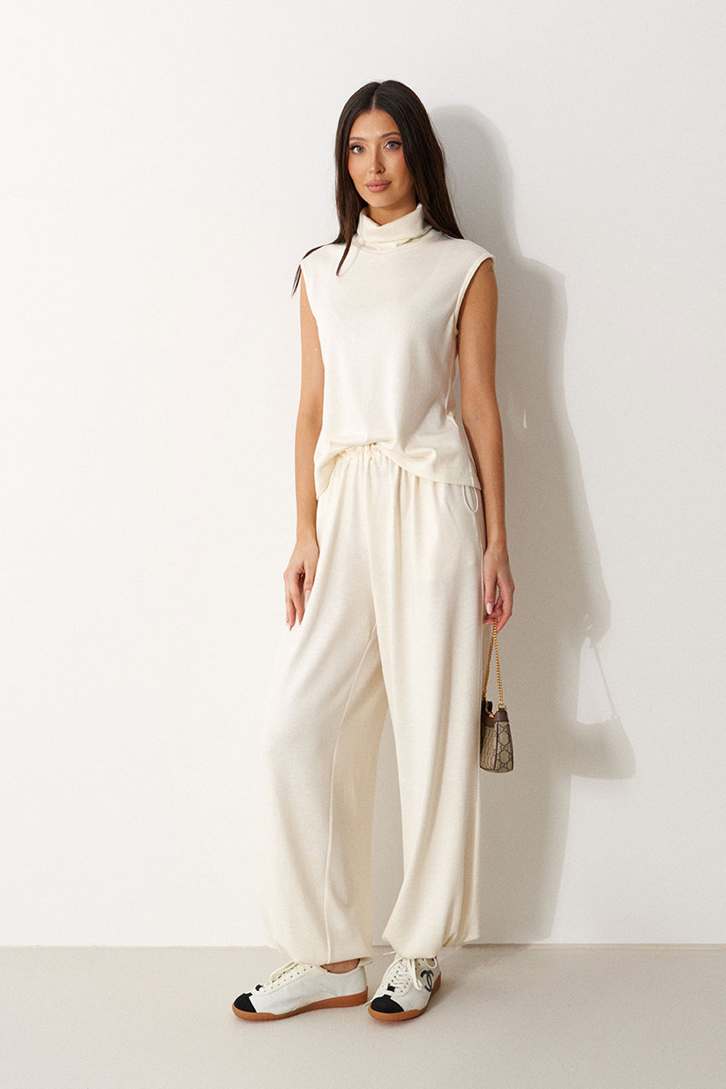Брюки-джоггеры выполнены из трикотажного полотна молочного цвета. Характеристики: прямой крой, пояс на шнурке-резинке с фиксатором, в боковых швах карманы, штанина внизу на резинке с фиксатором.