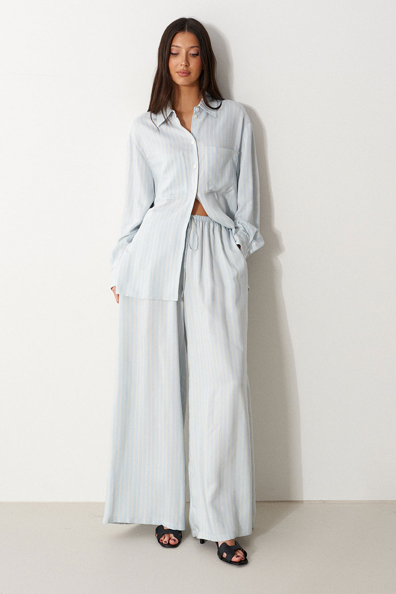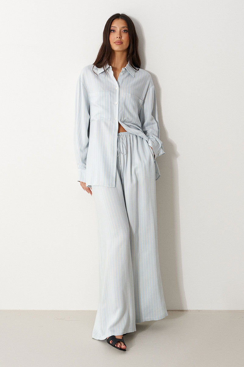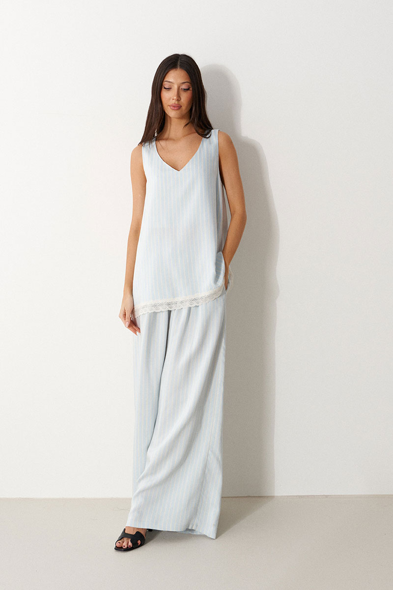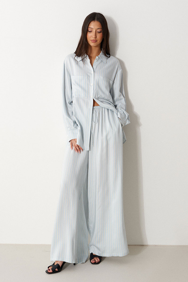 Брюки свободного кроя. Выполнены из мягкой струящейся ткани голубого цвета с белой полоской. Пояс на резинке, со шнурочком. В боковых швах карманы.