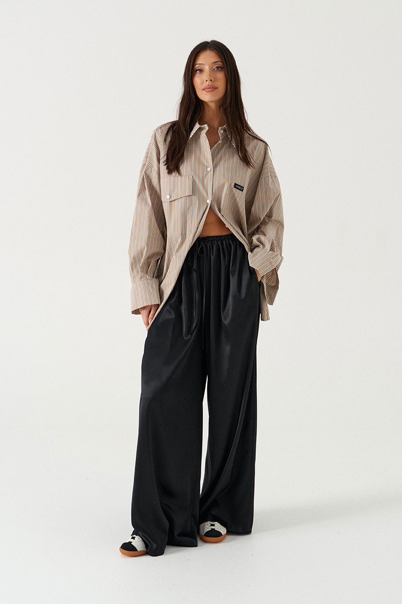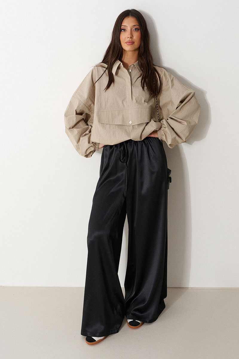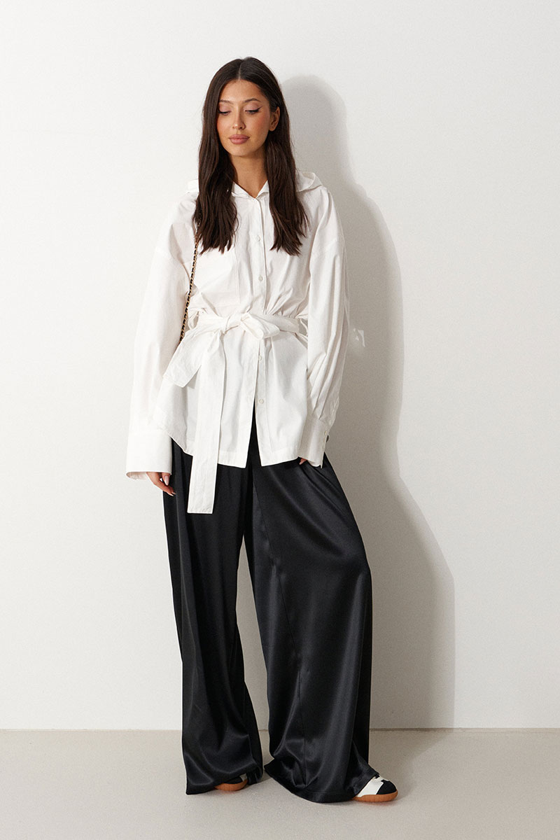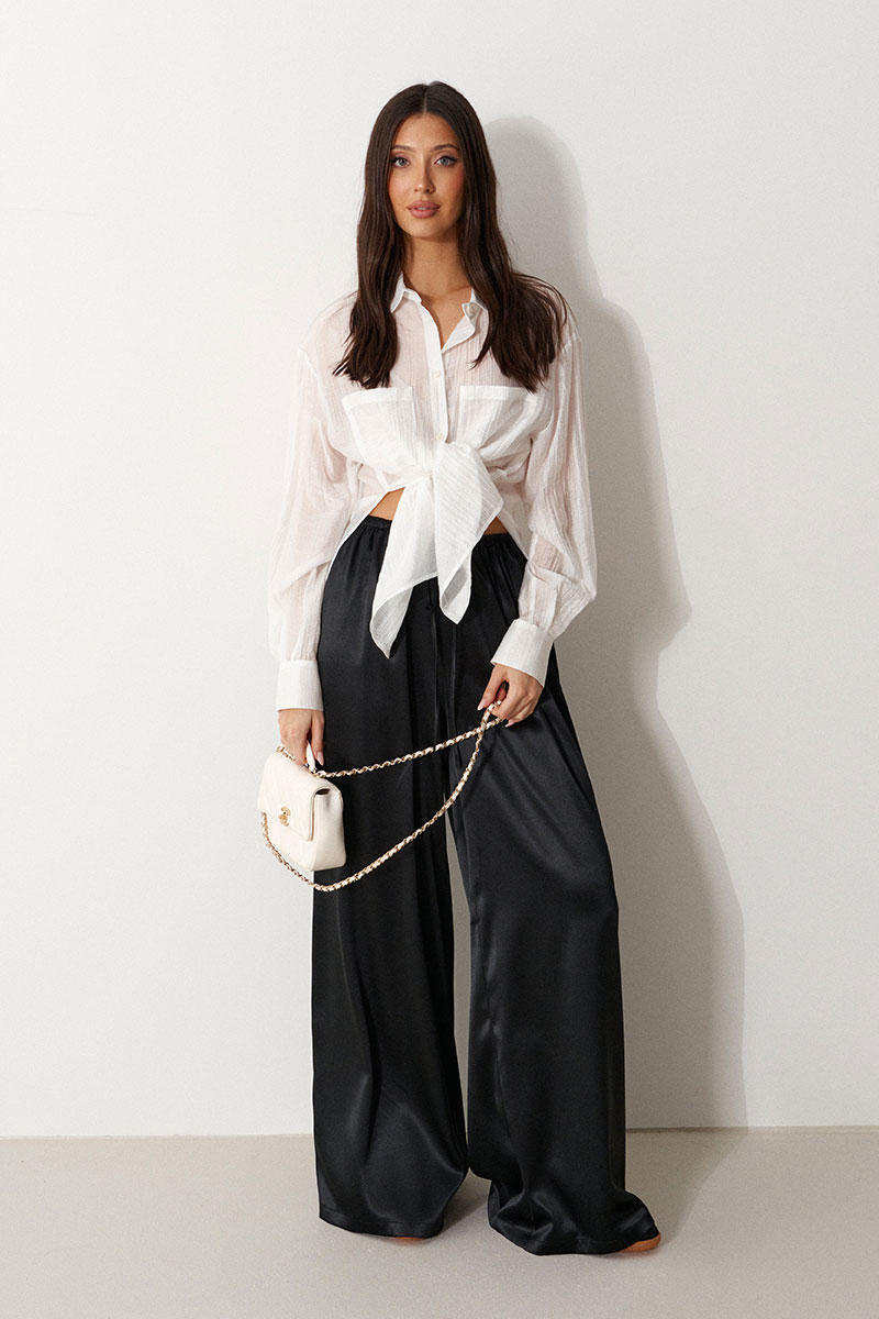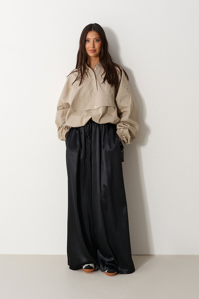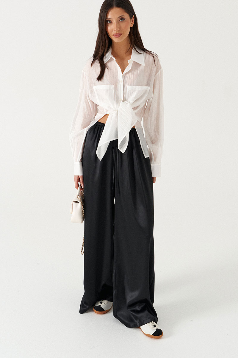 Брюки свободного кроя. Выполнены из мягкой струящейся ткани чёрного цвета. Пояс на резинке, со шнурочком. В боковых швах карманы.