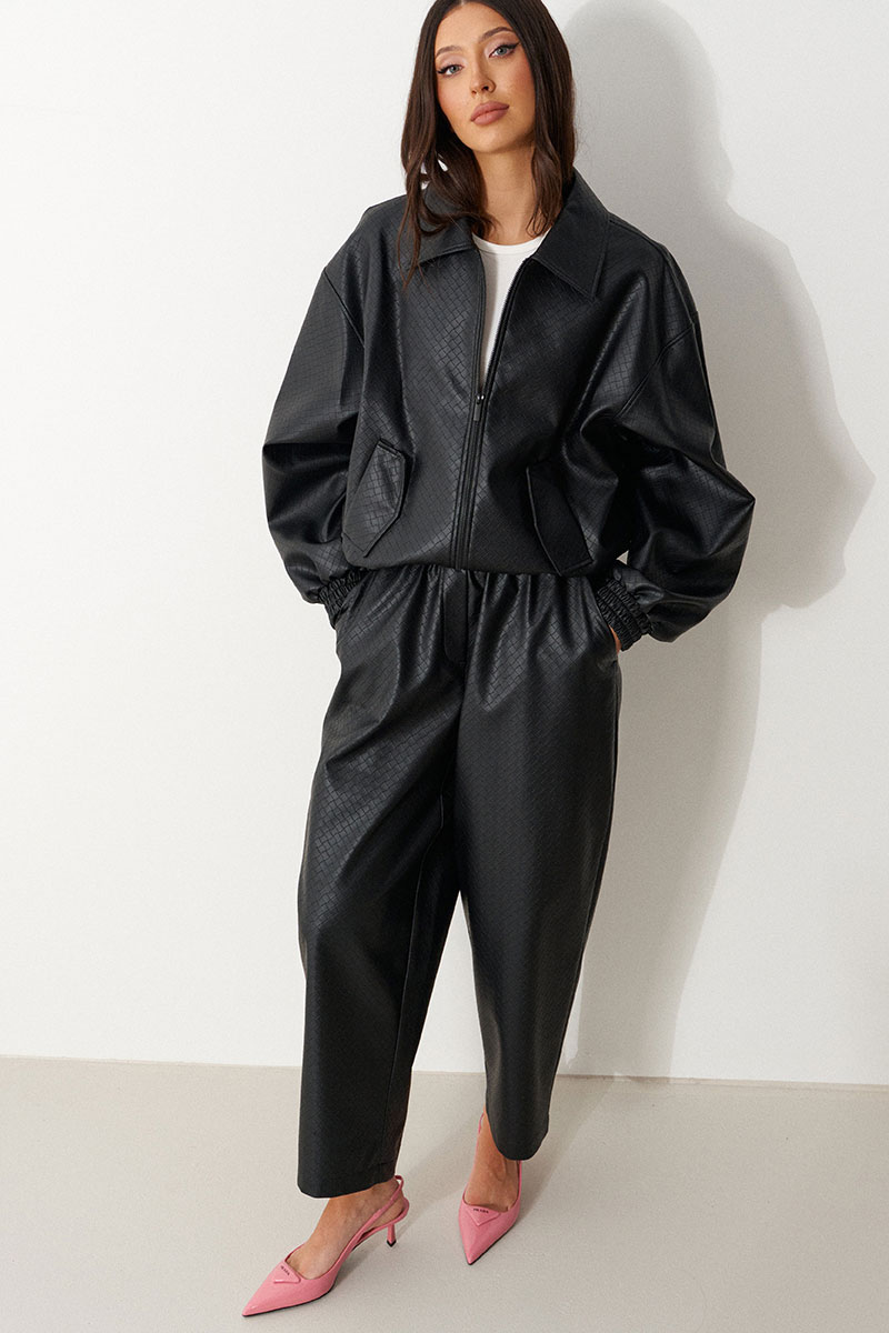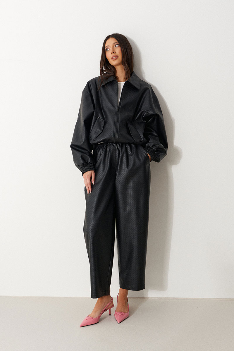 Брюки прямого кроя, выполнены из фактурной экокожи черного цвета. Характеристика: прямой крой, пояс на резинке, спереди есть имитация гульфика, без подкладки, в боковых швах карманы.