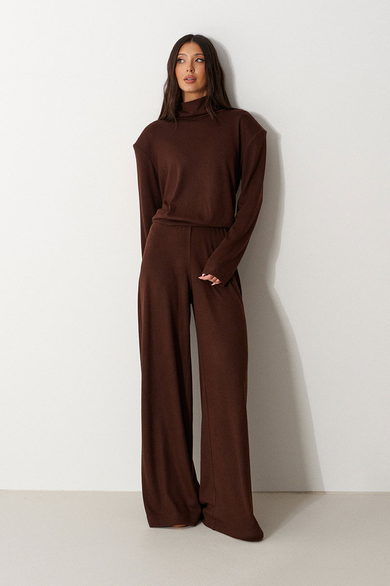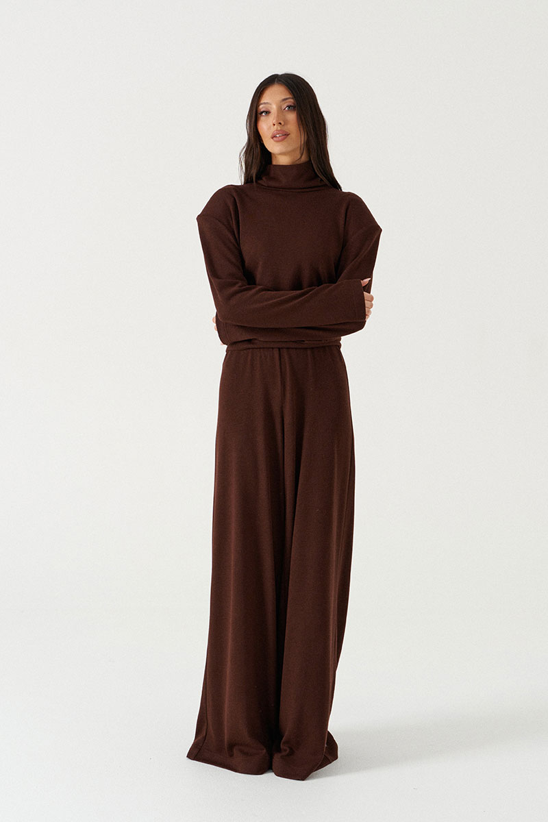 Брюки свободного кроя. Выполнены из мягкого трикотажа коричневого цвета. Пояс на резинке Застёжки нет, карманов нет.