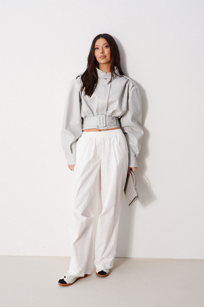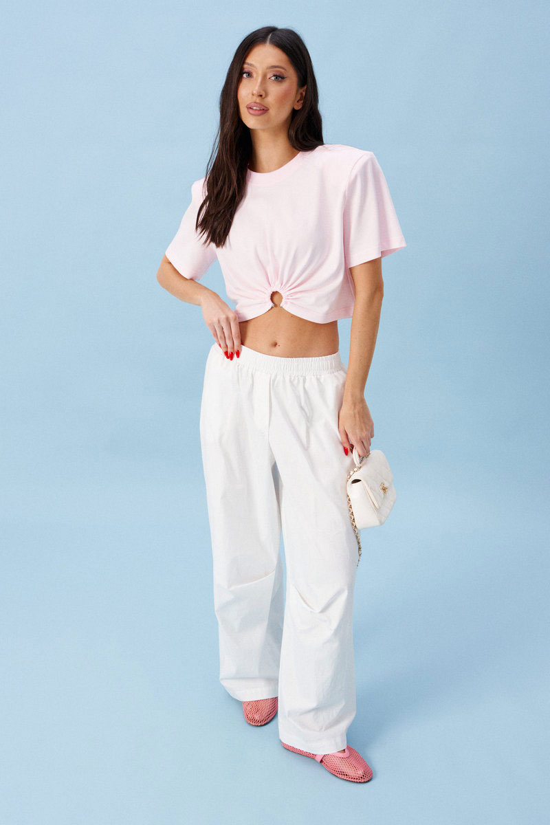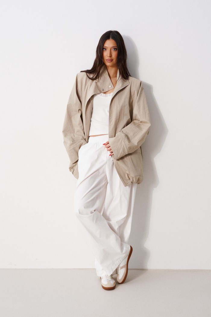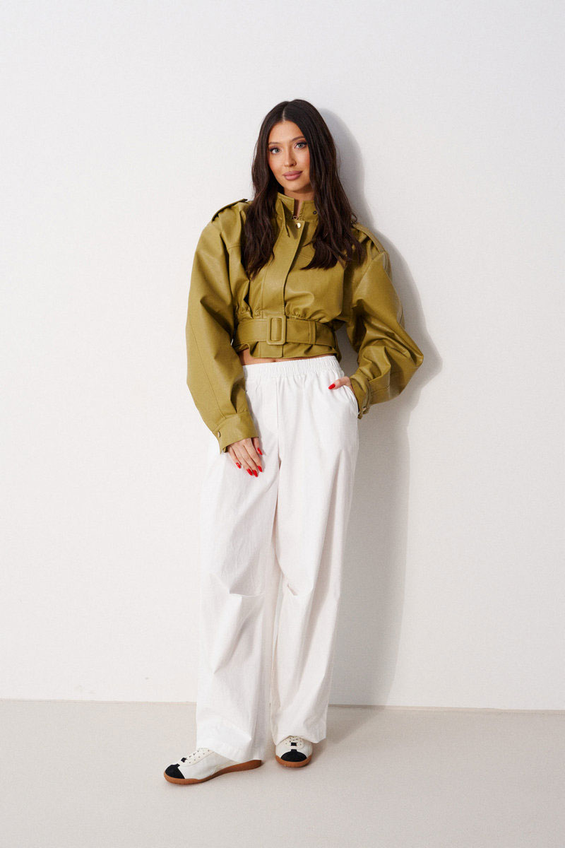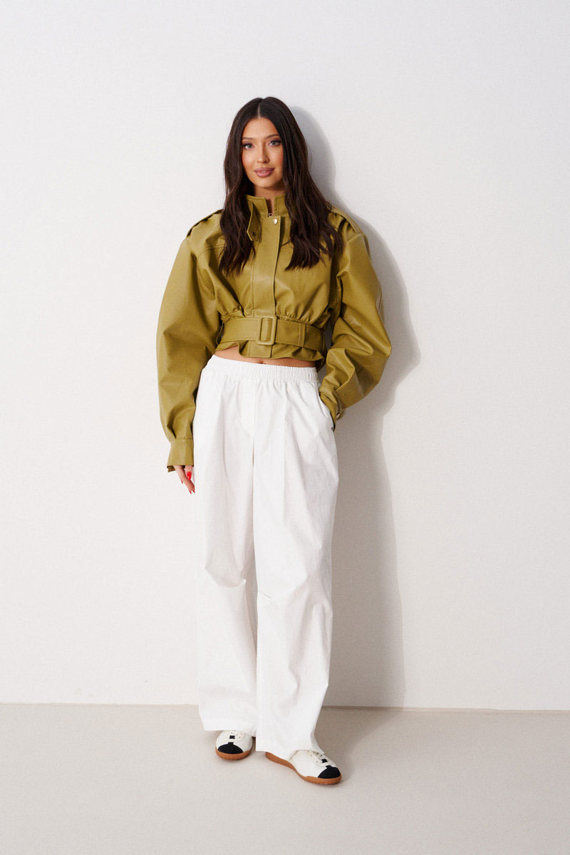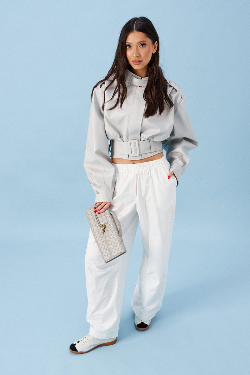 Брюки длинные, прямого силуэта, свободного облегания. Выполнены из хлопковой ткани средней плотности, белого цвета. Характеристика:В боковых швах карманы с отрезным бочком, по задним половинам накладные прямоугольные карманы.Пояс притачной, присборенный на резинку, с двумя отделочными строчками.По переду имитация гульфика.На уровне коленей по передним половинкам складки. Низ брюк обработан швом в подгибку.