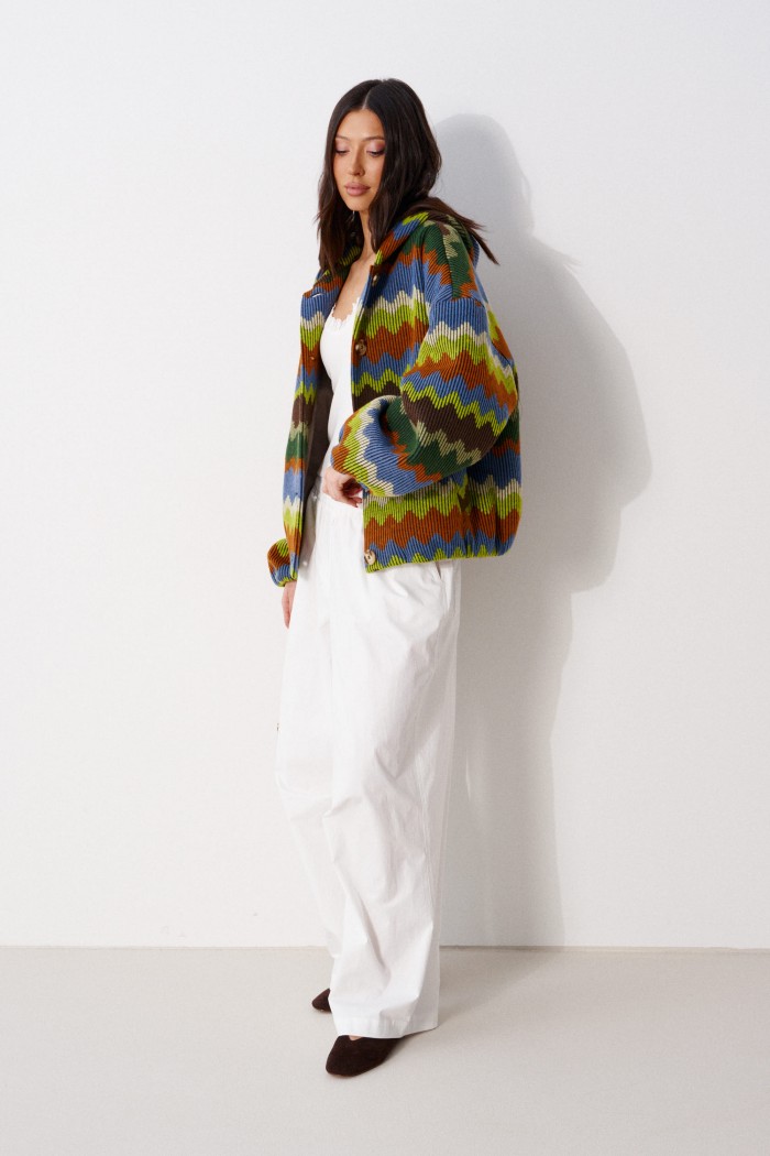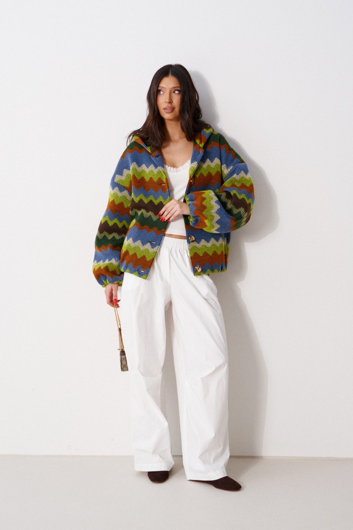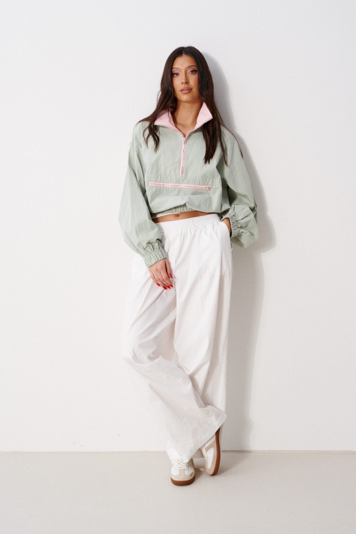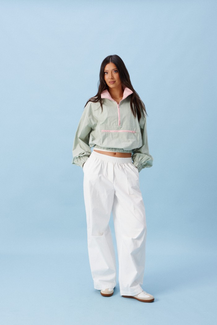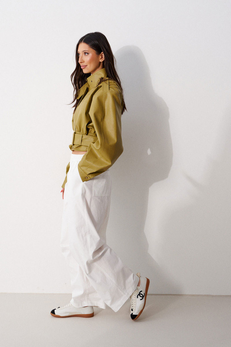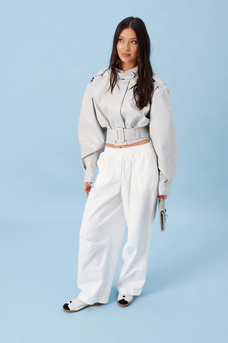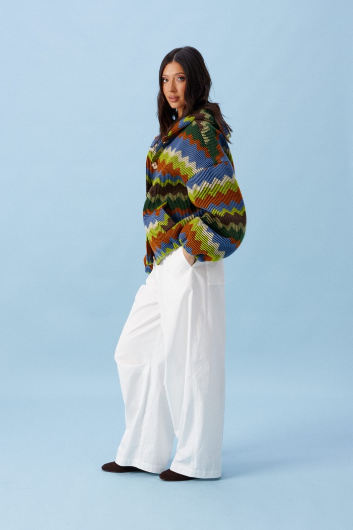 Брюки длинные, прямого силуэта, свободного облегания. Выполнены из хлопковой ткани средней плотности, белого цвета. Характеристика:В боковых швах карманы с отрезным бочком, по задним половинам накладные прямоугольные карманы.Пояс притачной, присборенный на резинку, с двумя отделочными строчками.По переду имитация гульфика.На уровне коленей по передним половинкам складки. Низ брюк обработан швом в подгибку.