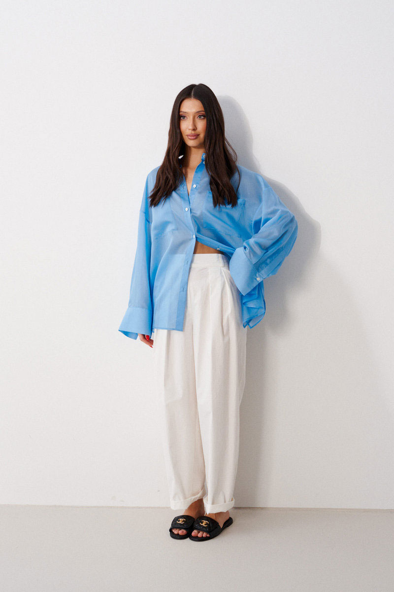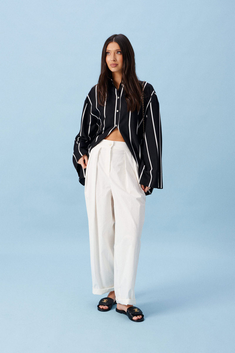Брюки прямого свободного кроя, выполнены из хлопкового полотна белого цвета. Характеристика: прямой крой, застежка центральная на пуговицу и замок, скрывающийся под гульфиком, пояс частично на резинке ( со спинки ), в боковых швах карманы, по передней части изделия декоративные складки.