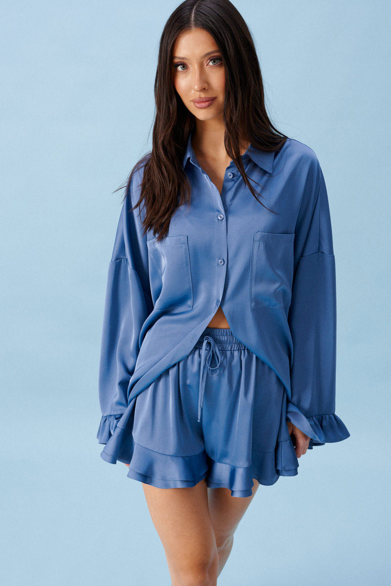 Шорты свободного кроя, выполнены из струящайся ткани синего цвета. Пояс на резинке с кулиской, по низу шорт нашита рюша из ткани основного изделия.