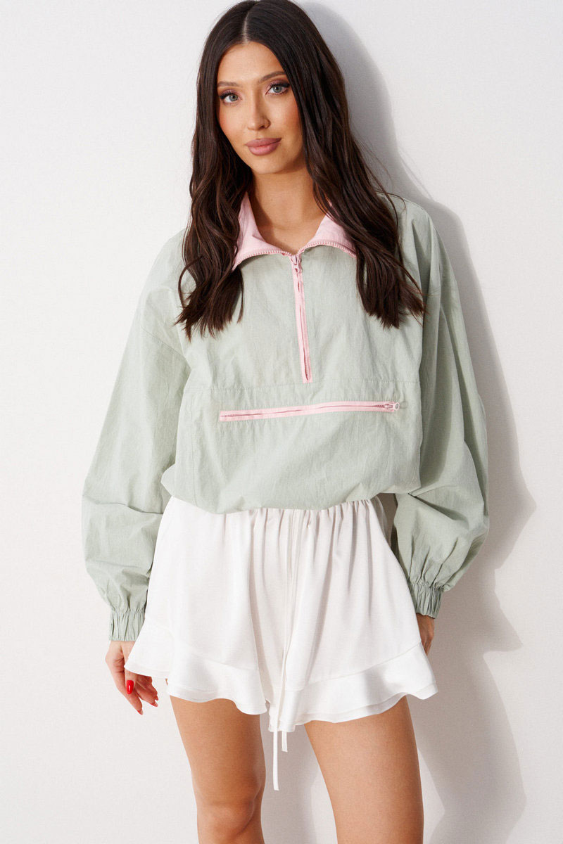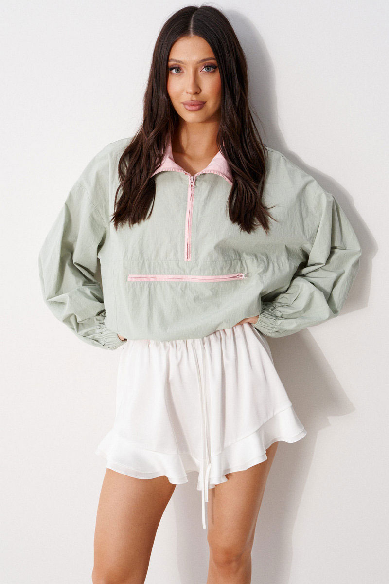 Шорты свободного кроя, выполнены из струящайся ткани синего цвета. Пояс на резинке с кулиской, по низу шорт нашита рюша из ткани основного изделия.