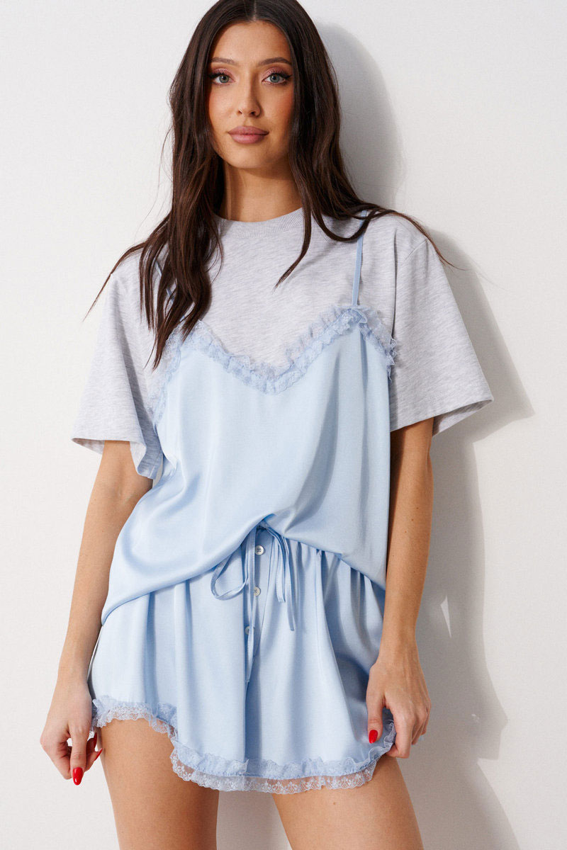 Шорты свободного кроя выполнены из струящейся ткани нежно-голубого цвета. Характеристики: свободный крой, пояс на резинке с кулиской, по переду три декоративные пуговицы, по низу шорты с фигурным вырезом и украшены ажурным кружевом.