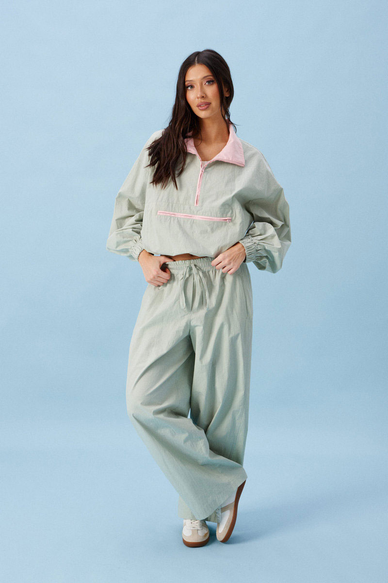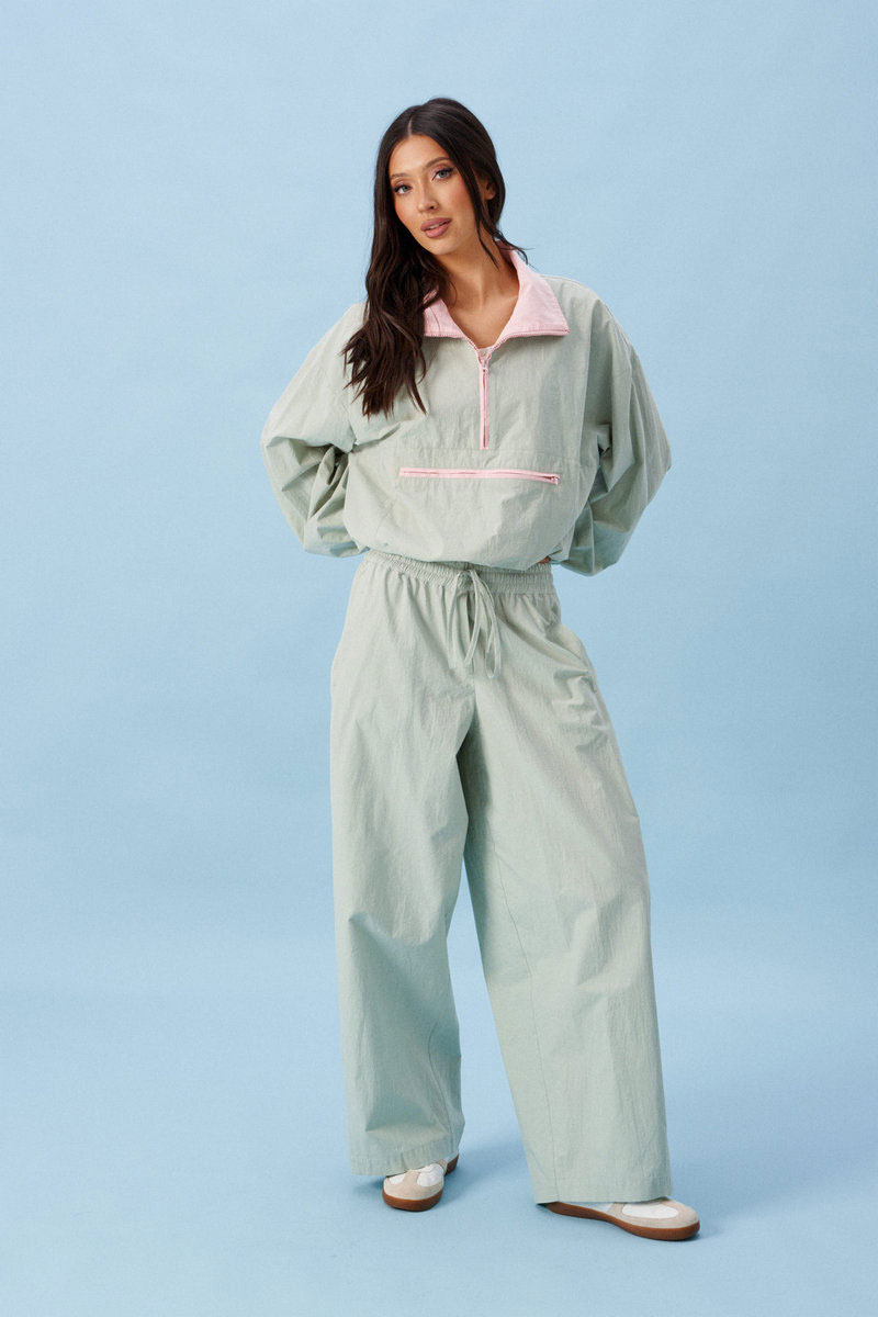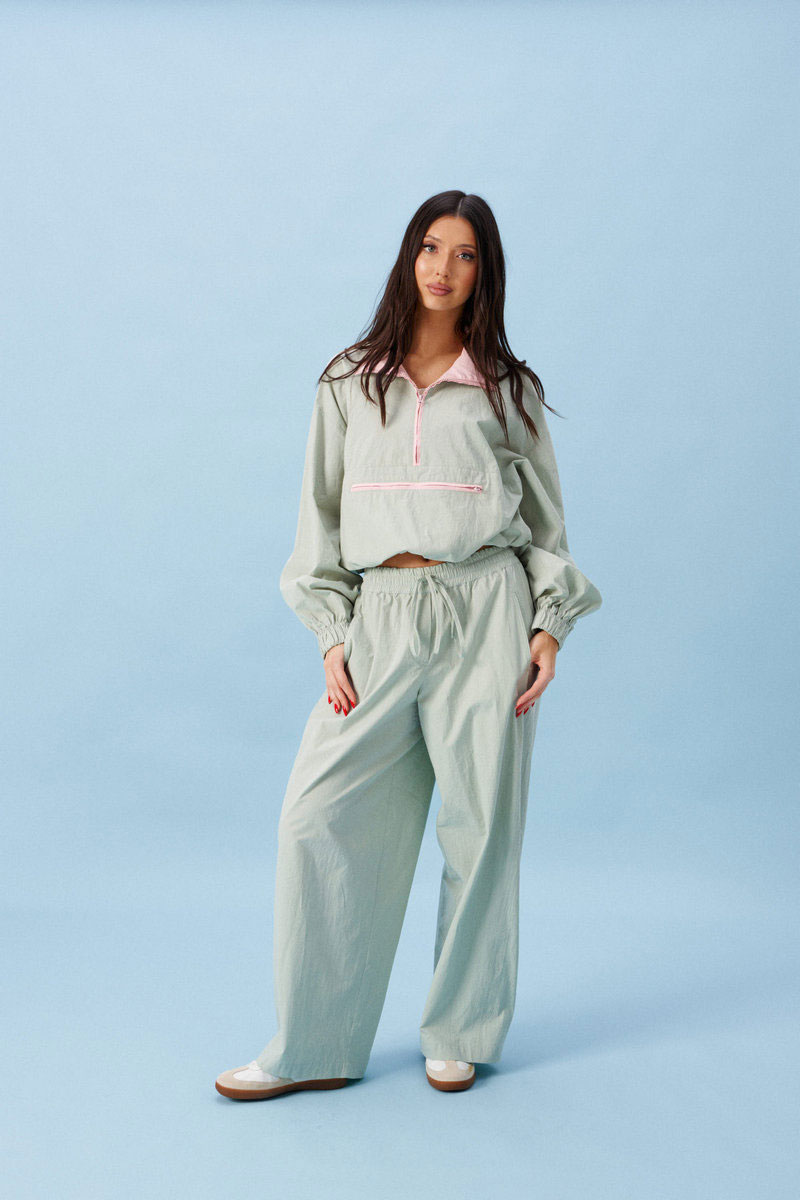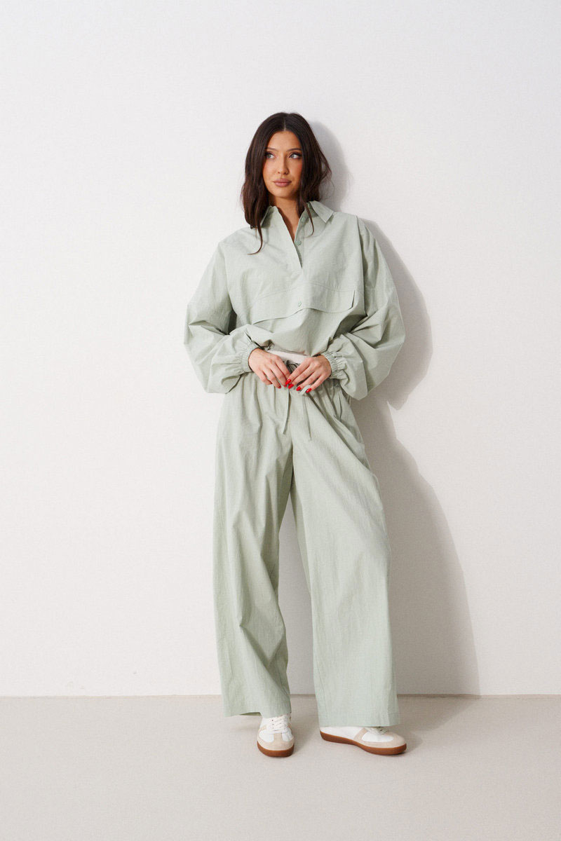Брюки свободного кроя. Пояс на резинке, с завязками. Есть прорезные карманы.
